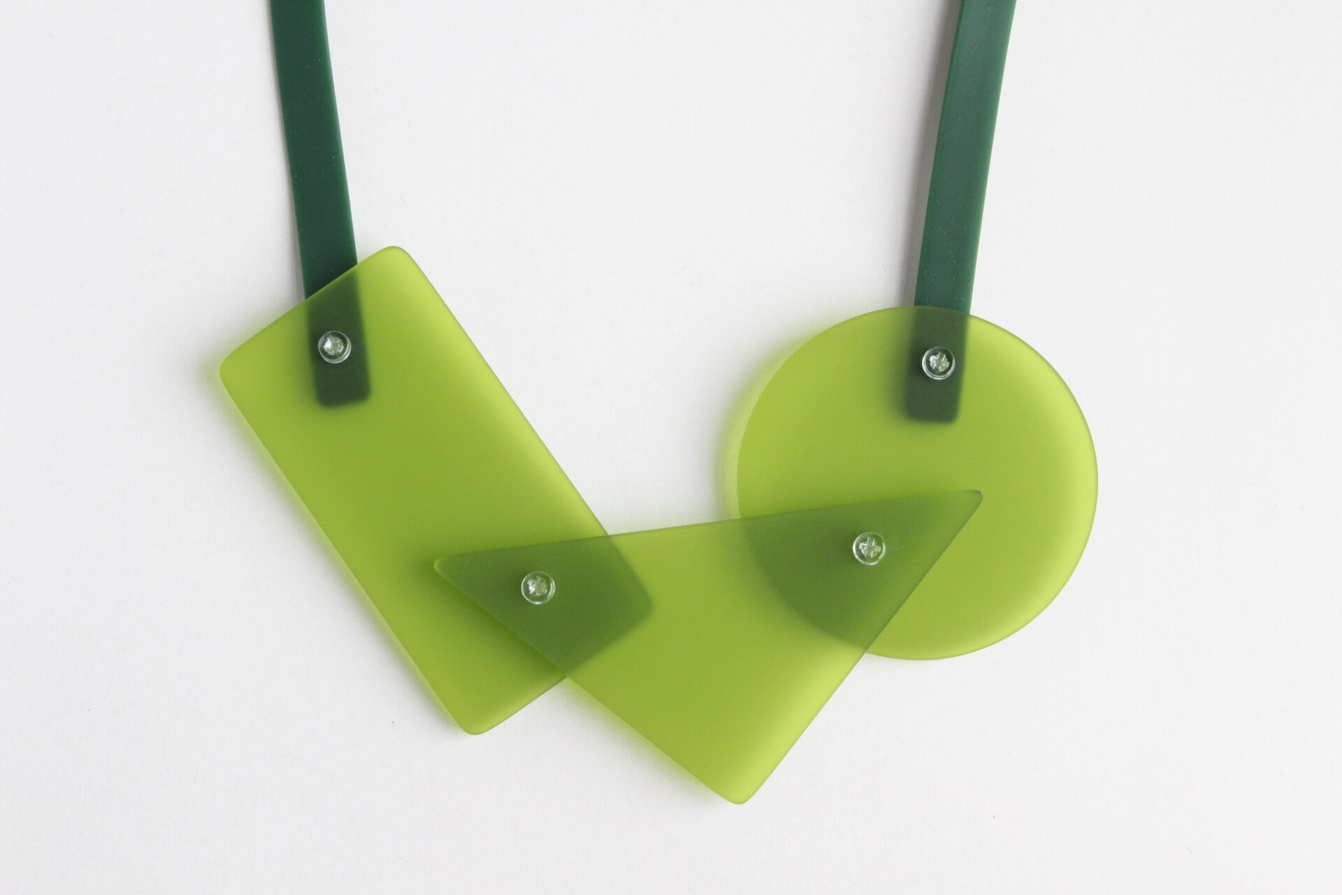Ketting van grasgroen opaal acrylaat aan een donkergroen rubber band verbonden met boutjes en moertjes van transparant acrylaat.