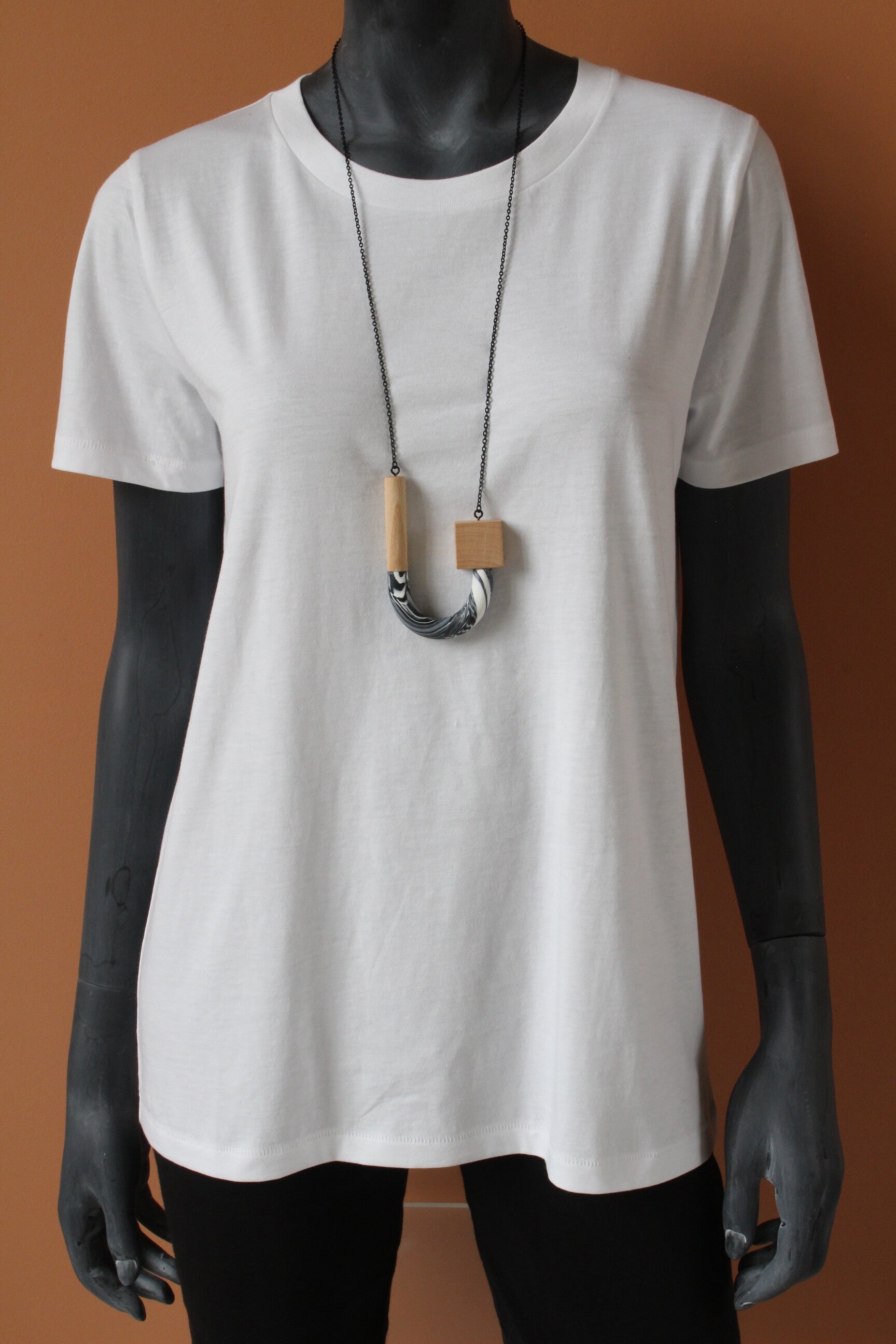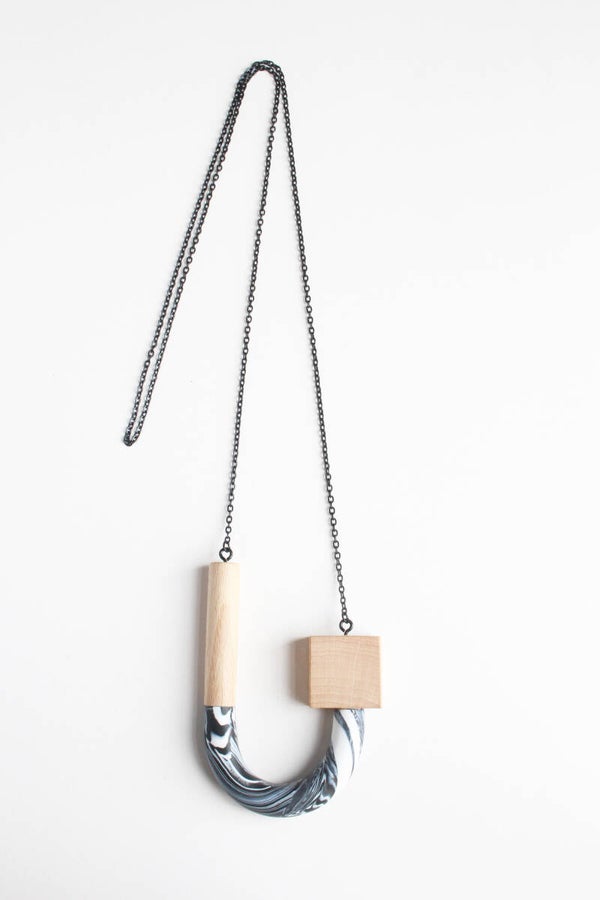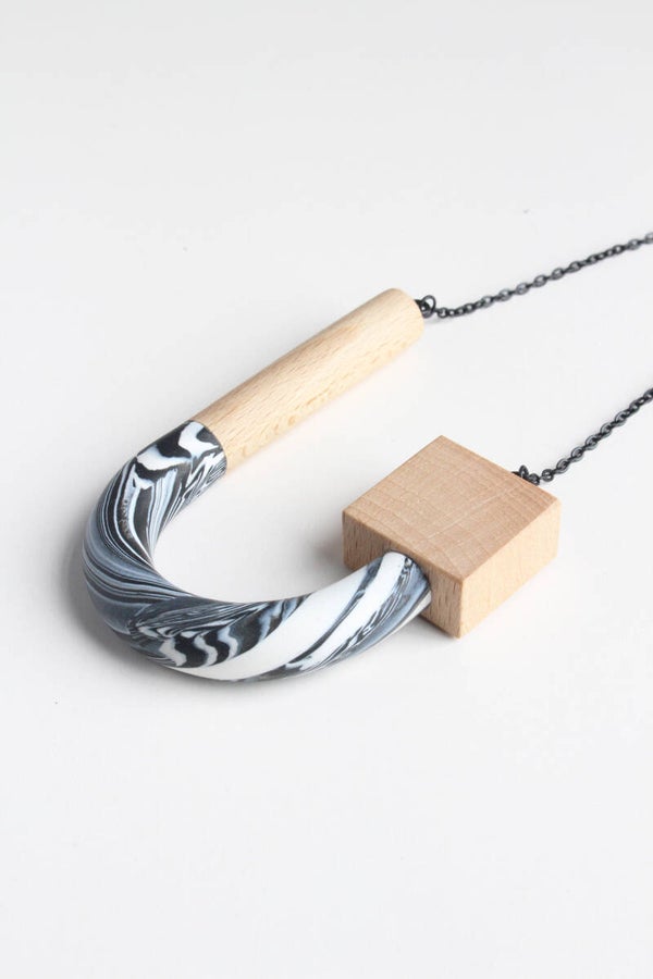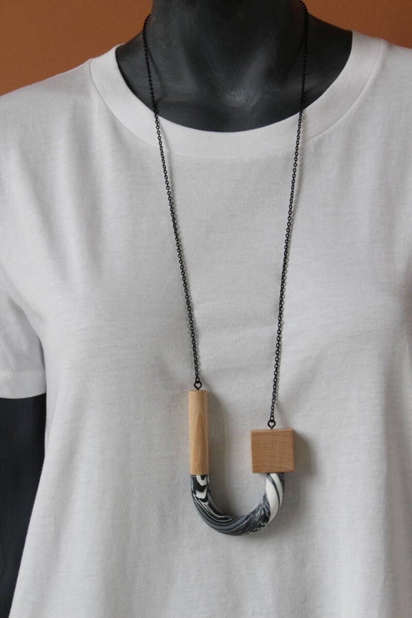 Ketting van polymeerklei en beukenhout aan een zwarte metalen ketting. De hanger is voorzien van een wax om het materiaal te beschermen tegen vocht en vuil.