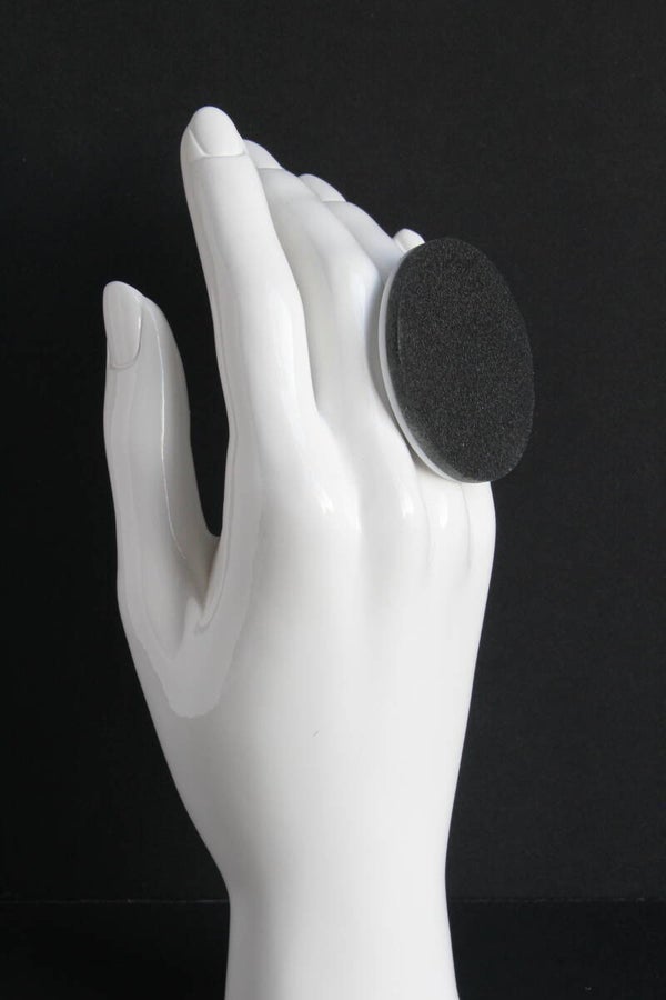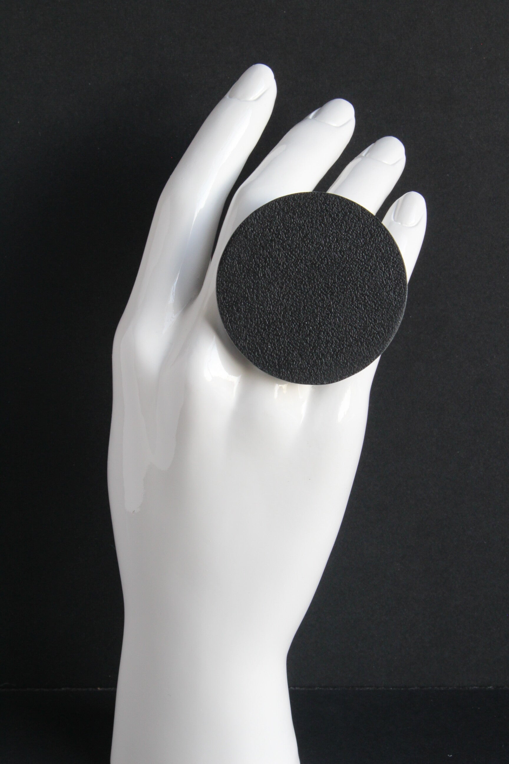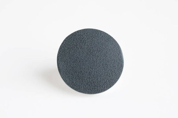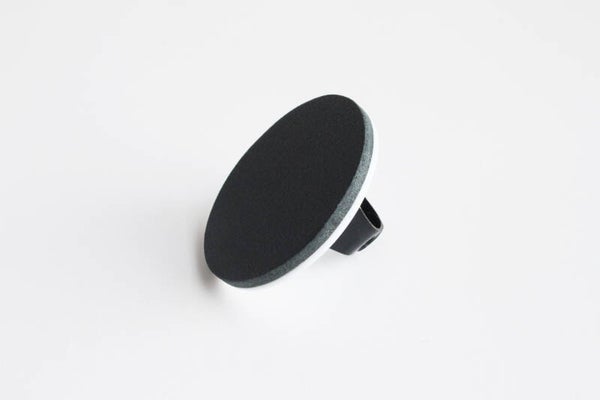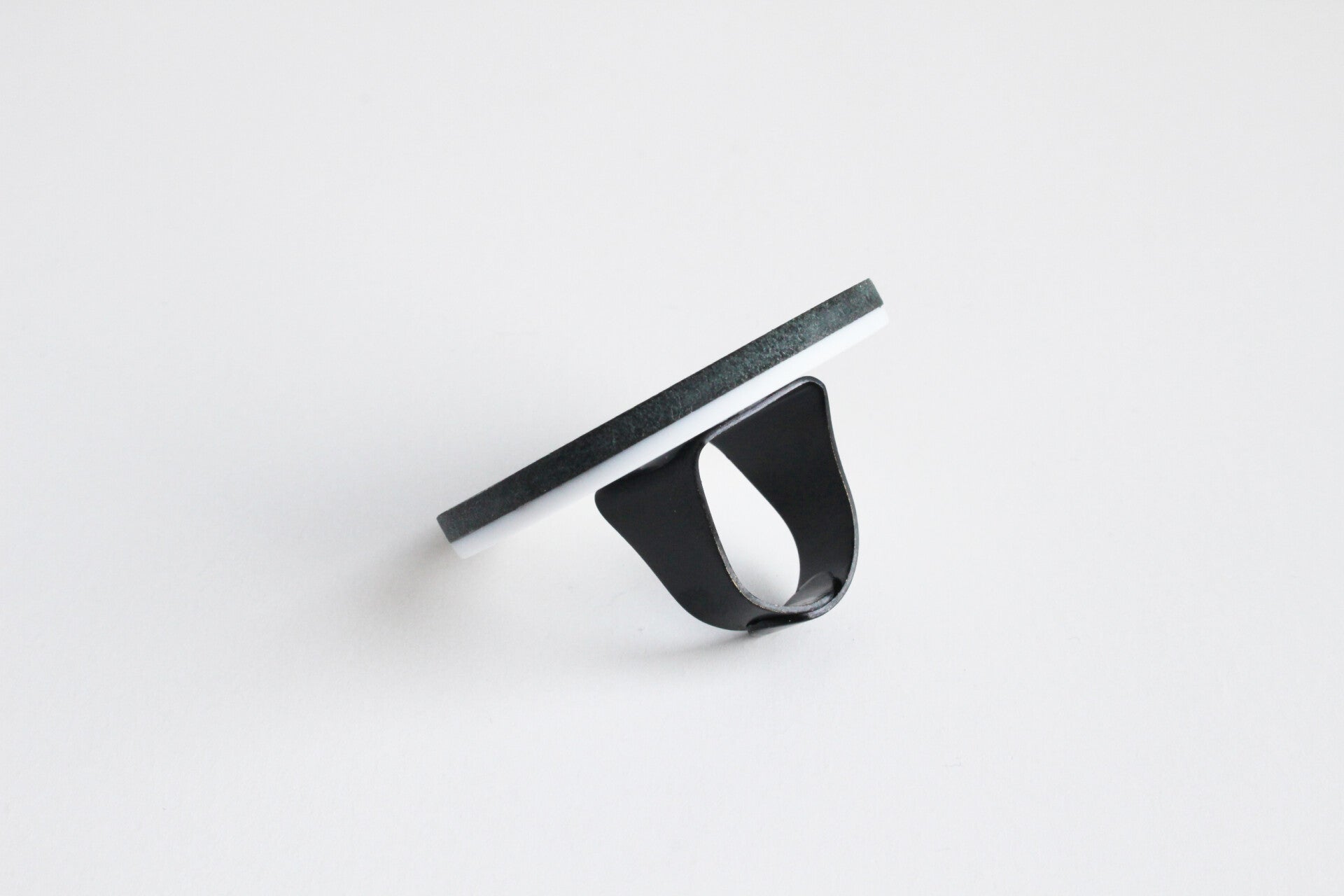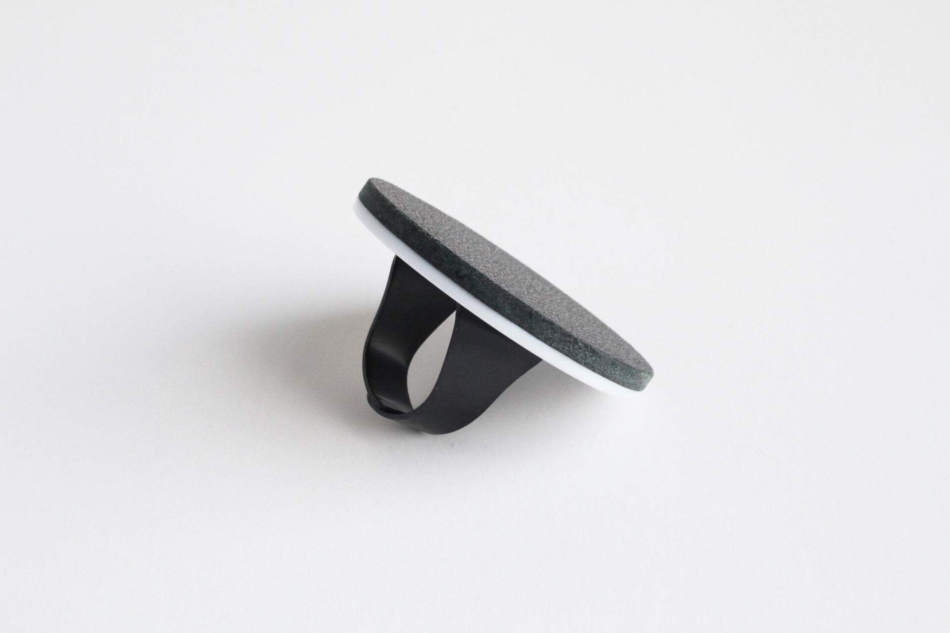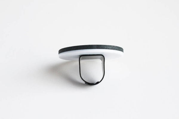 Verstelbare zwart gecoate metalen ring van wit acrylaat gelamineerd met zwart tuigleer.