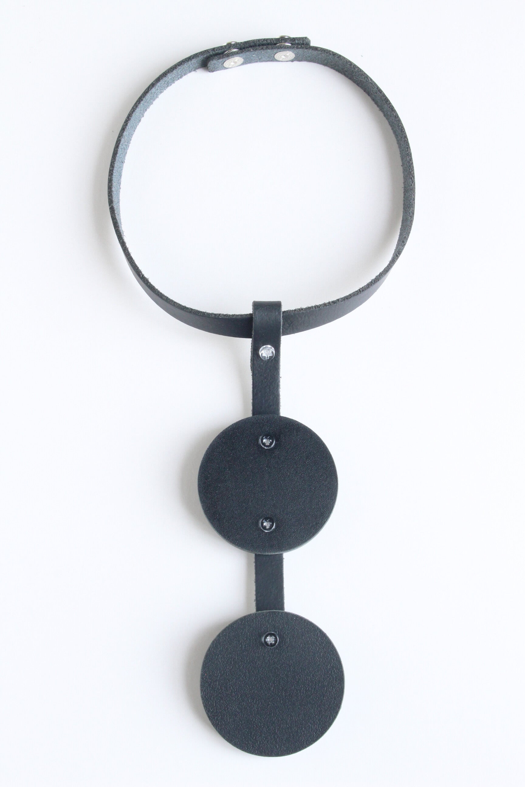 De ketting bestaat uit een verstelbare halsband van leer vast te maken met drukknoopjes. Hieraan een hanger met 2 cirkels van zwart acrylaat gelamineerd met zwart tuigleer. De onderdelen zijn verbonden met transparante boutjes en moertjes van acrylaat.