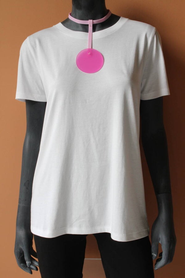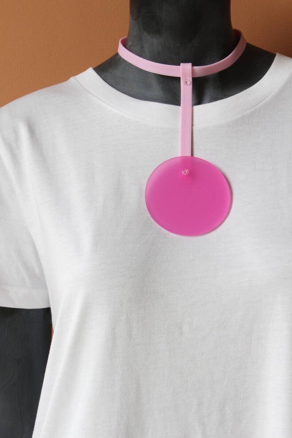 De ketting bestaat uit een verstelbare halsband van lichtroze rubber band, vast te maken met drukknoopjes. Hieraan een hanger met een cirkel van roze opaal acrylaat. De onderdelen zijn verbonden met transparante boutjes en moertjes van acrylaat.
