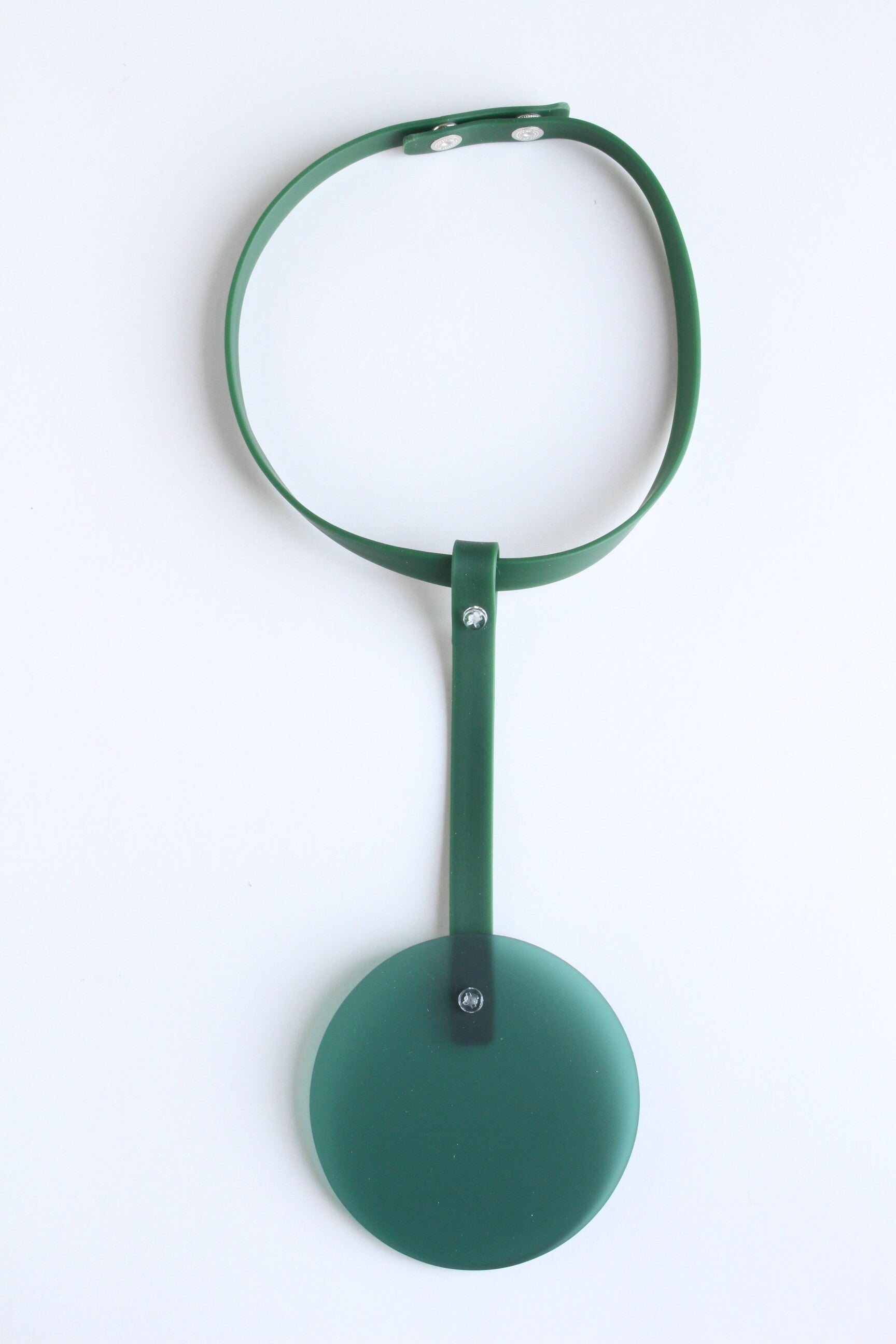 De ketting bestaat uit een verstelbare halsband van donkergroen rubber band, vast te maken met drukknoopjes. Hieraan een hanger met een cirkel van donkergroen opaal acrylaat. De onderdelen zijn verbonden met transparante boutjes en moertjes van acrylaat.