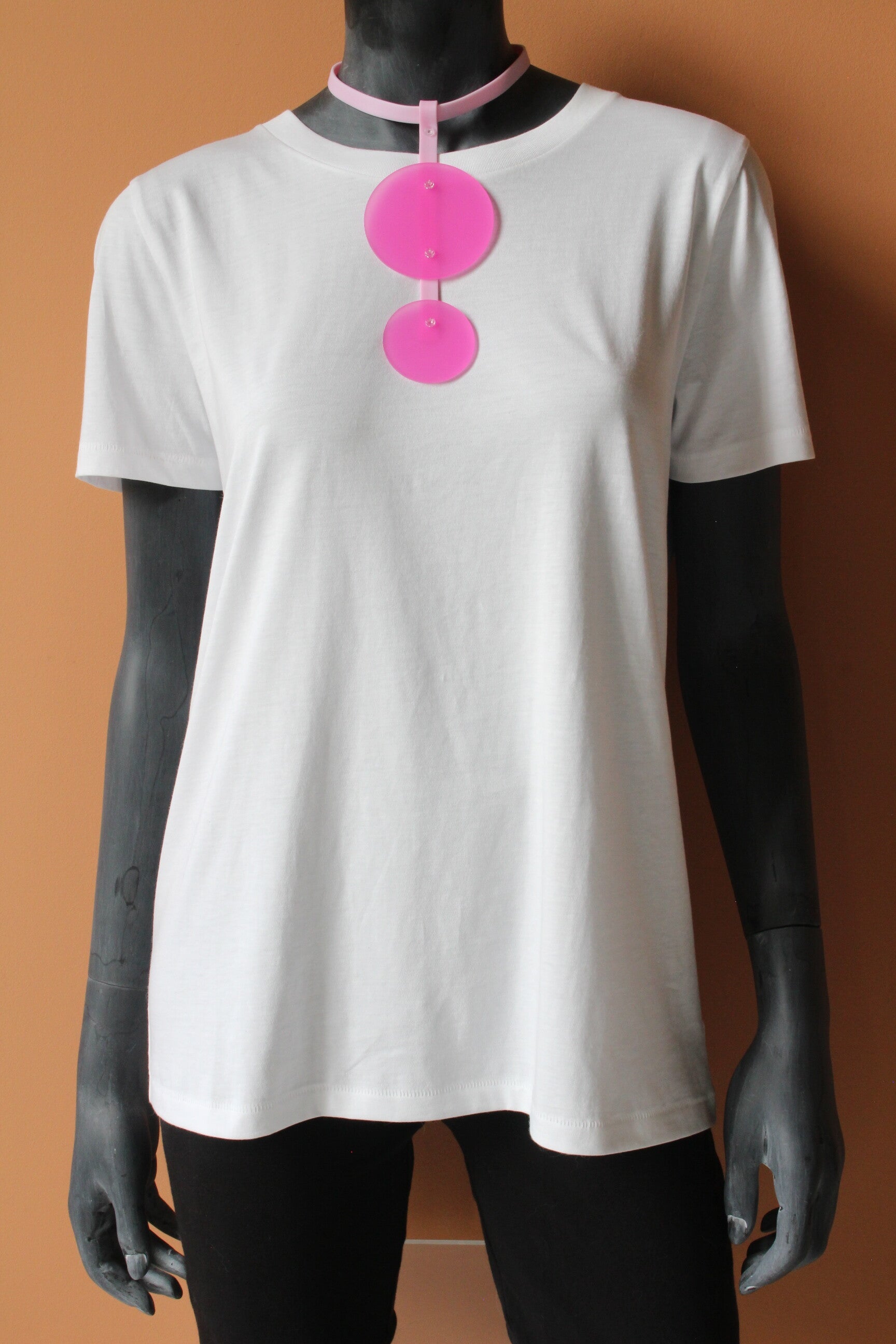 De ketting bestaat uit een verstelbare halsband van lichtroze rubber band, vast te maken met drukknoopjes. Hieraan een hanger met cirkels van roze opaal acrylaat. De onderdelen zijn verbonden met transparante boutjes en moertjes van acrylaat.