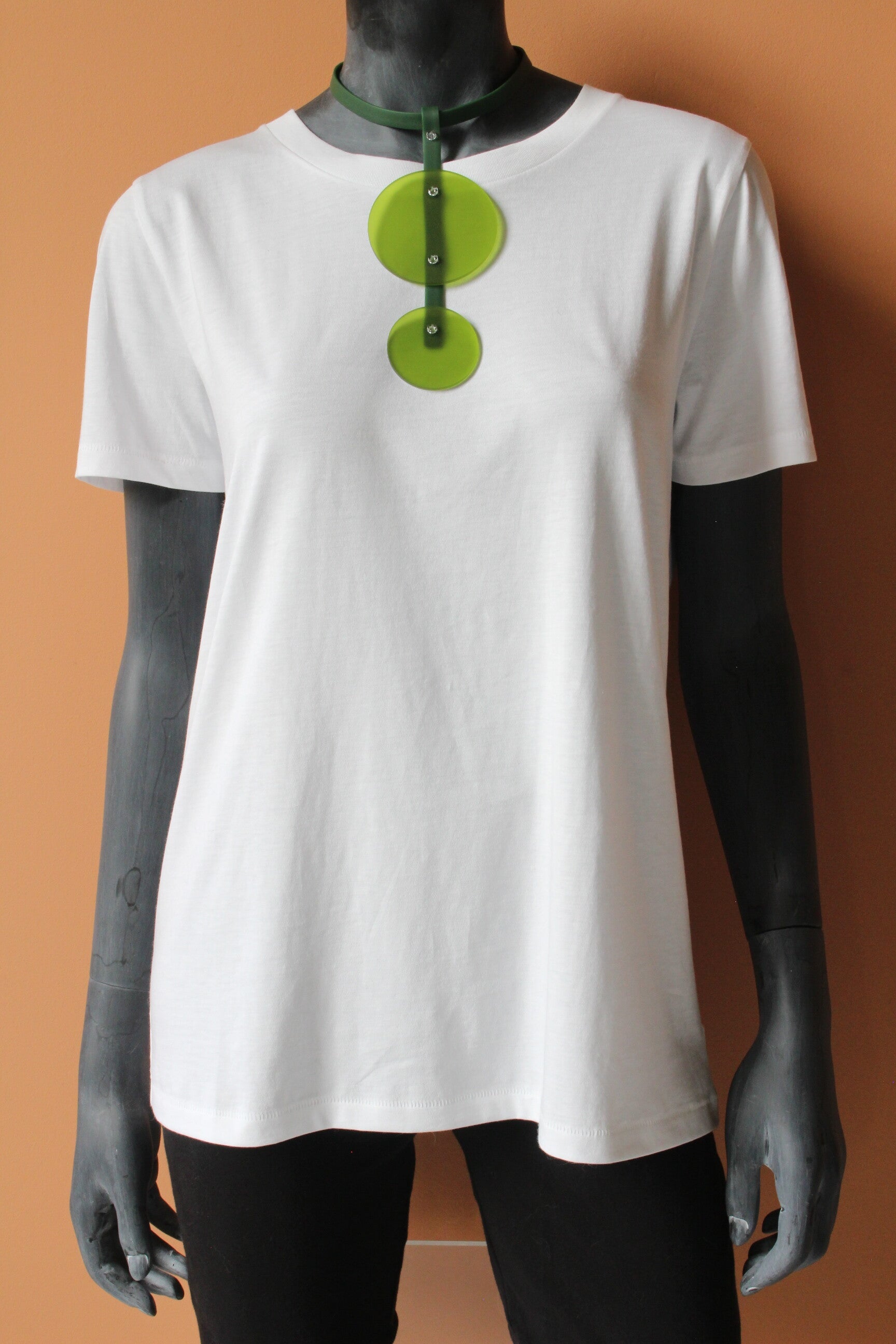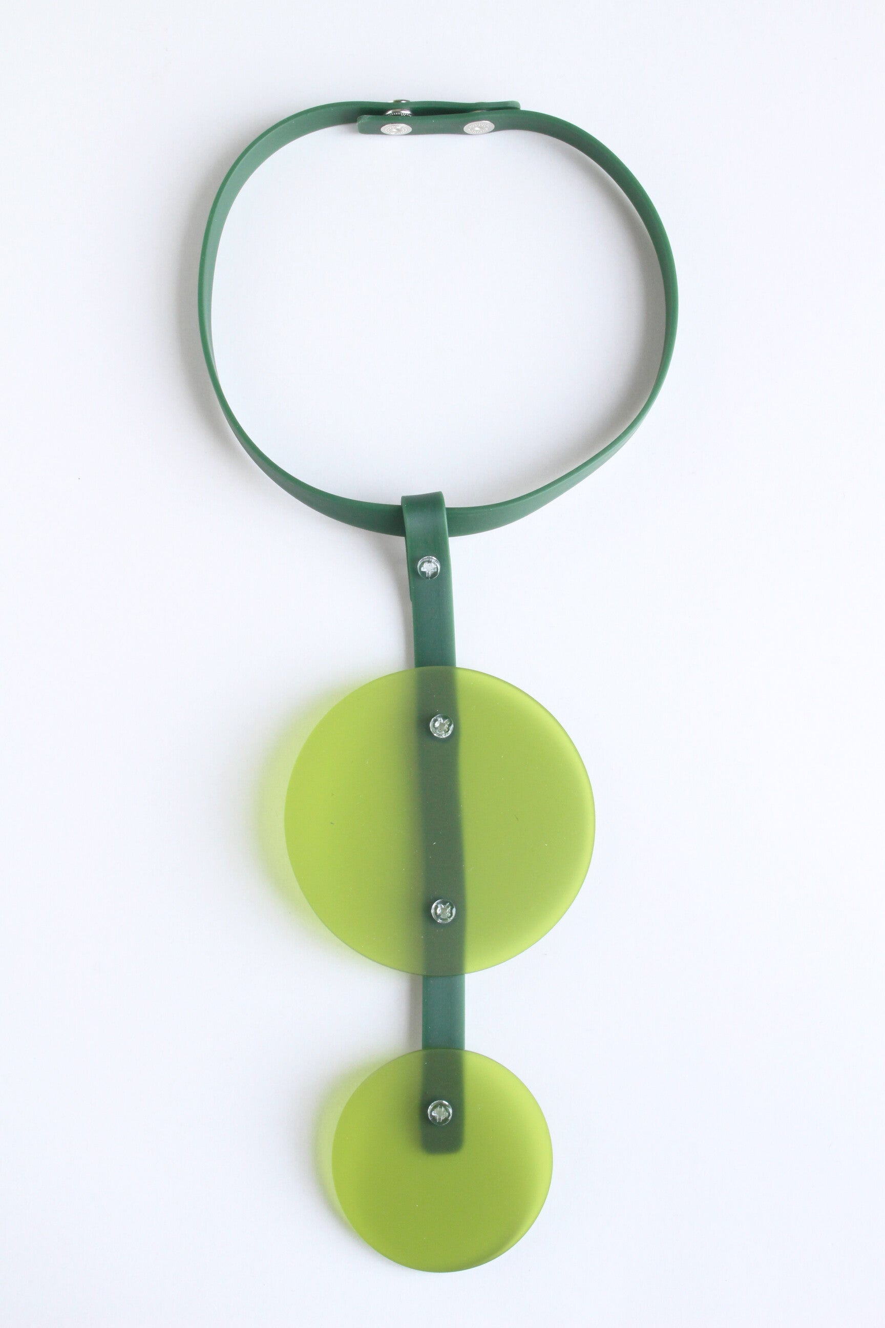 De ketting bestaat uit een verstelbare halsband van donkergroen rubber band, vast te maken met drukknoopjes. Hieraan een hanger met cirkels van groen opaal acrylaat. De onderdelen zijn verbonden met transparante boutjes en moertjes van acrylaat.