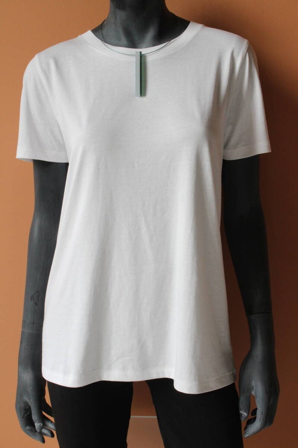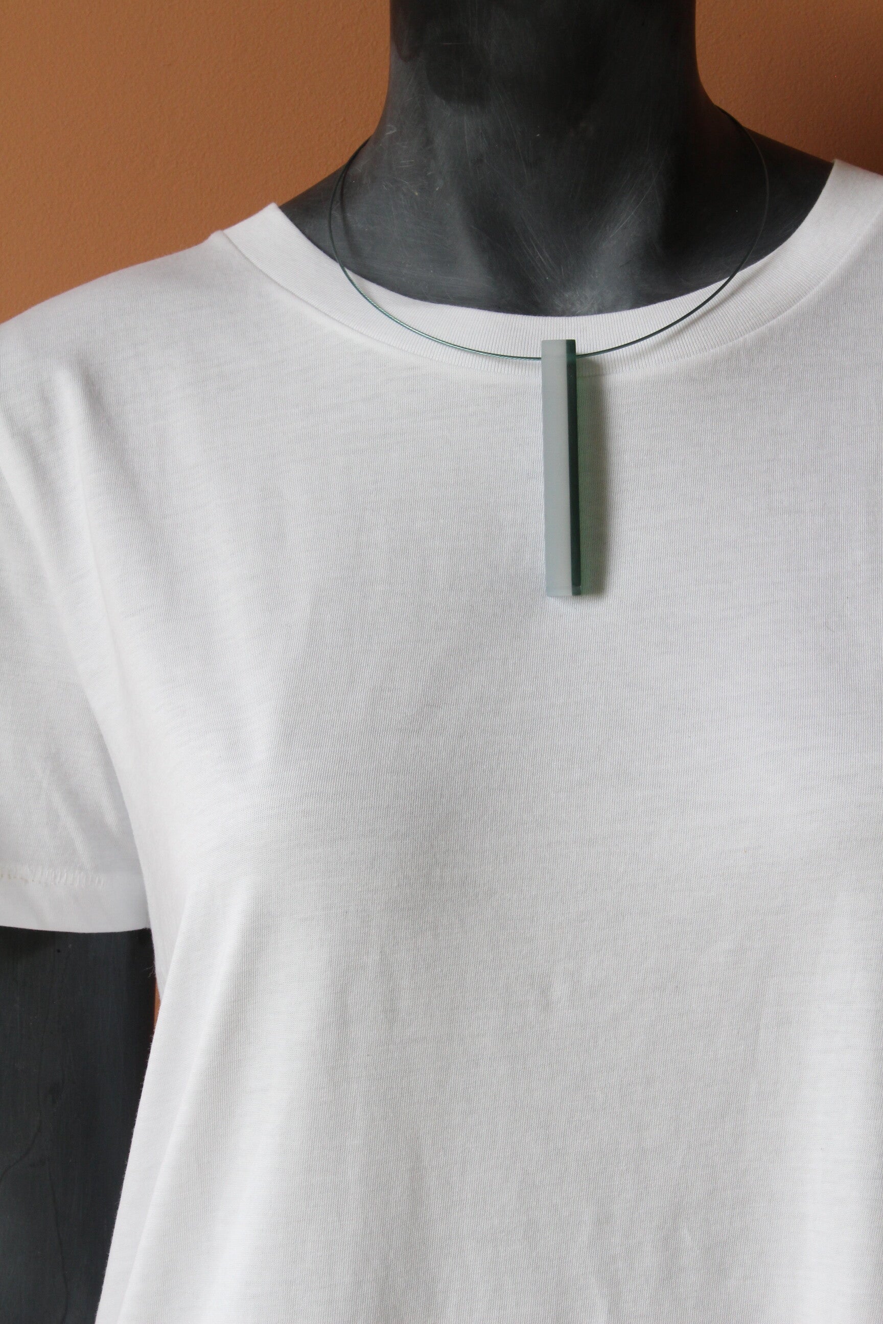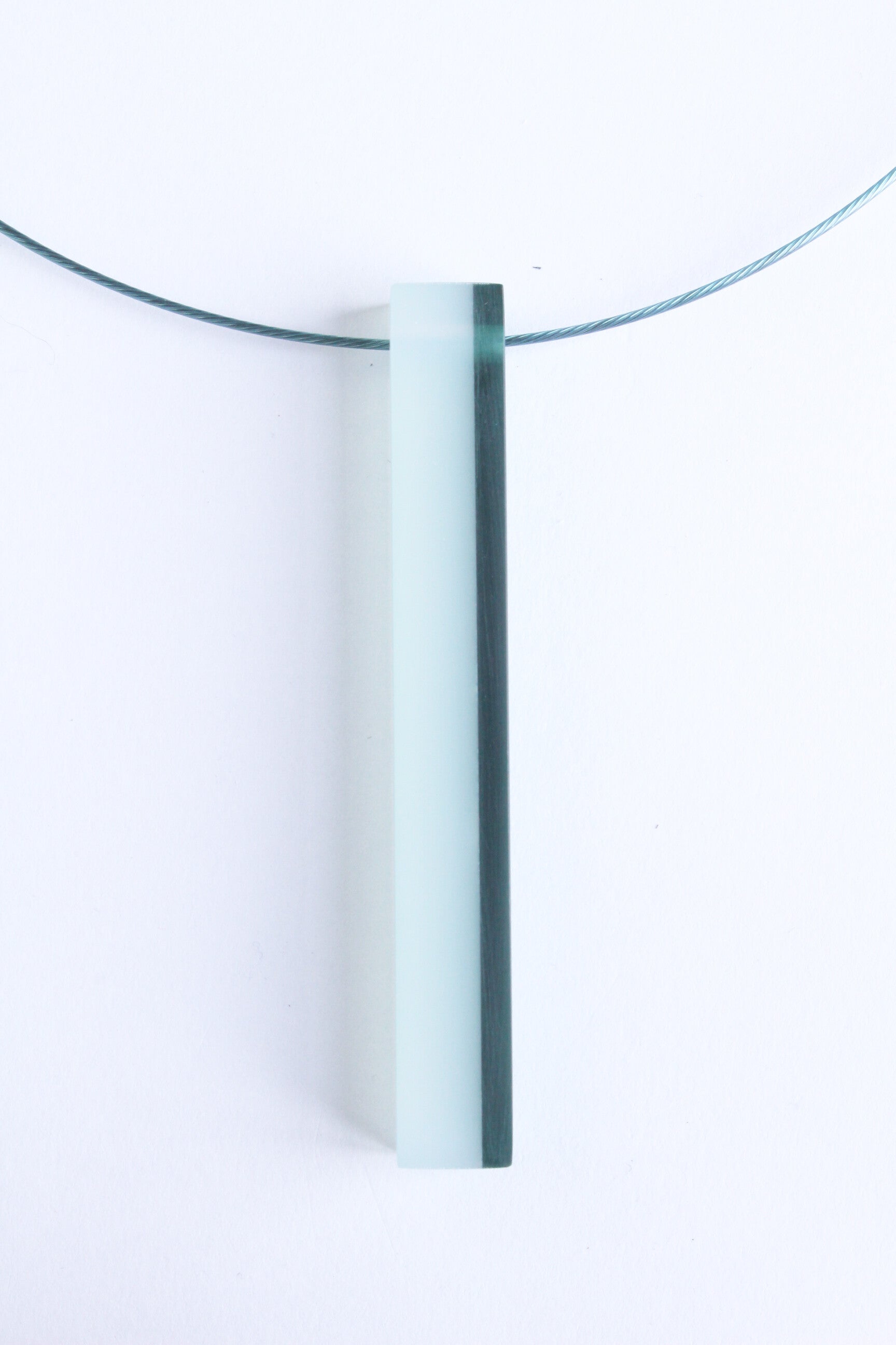 Hanger van gelamineerd donkergroen en zachtgroen acrylaat aan een spang van staaldraad met een draaisluiting. Hanger: hoogte ±8 cm x breedte ±1 cm, spang: lengte ±45 cm.