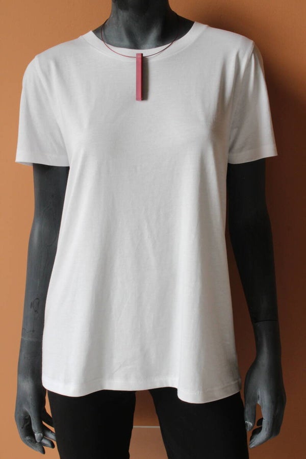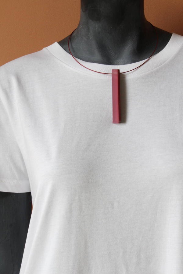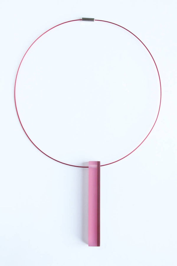 Hanger van gelamineerd aubergine en zachtroze acrylaat aan een spang van staaldraad met een draaisluiting. Hanger: hoogte ±8 cm x breedte ±1 cm, spang: lengte ±45 cm.