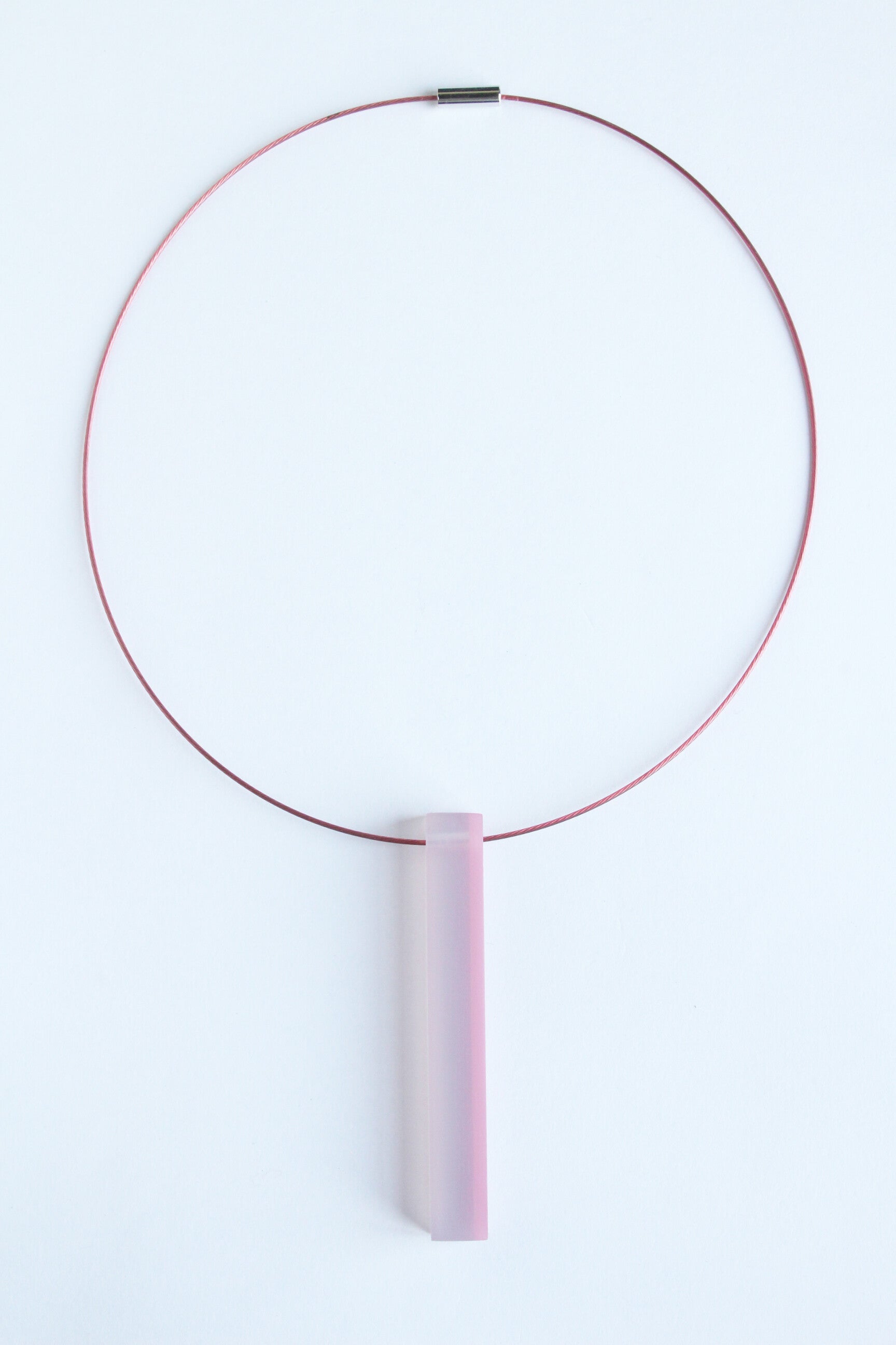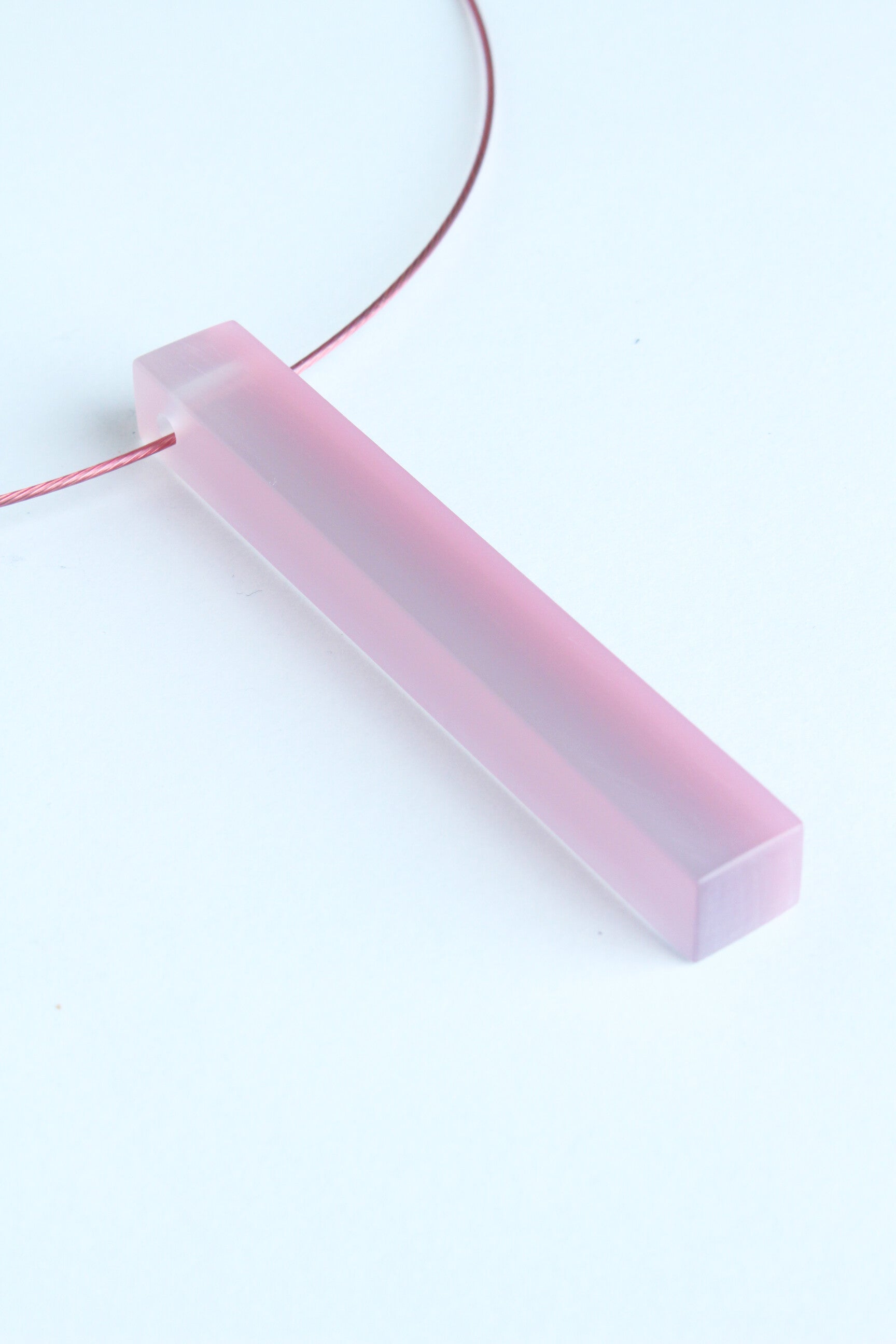 Hanger van gelamineerd lichtroze en zachtroze acrylaat aan een spang van staaldraad met een draaisluiting. Hanger: hoogte ±8 cm x breedte ±1 cm, spang: lengte ±45 cm.