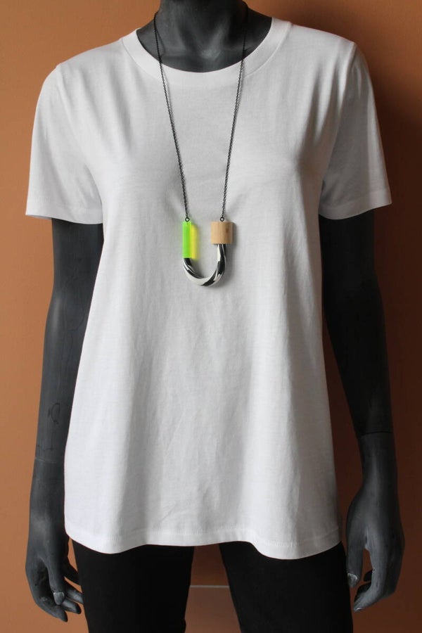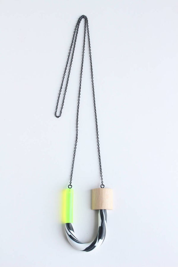 Ketting van polymeerklei, beukenhout en fluorgeel acrylaat aan een zwarte metalen ketting. De hanger is voorzien van een wax om het materiaal te beschermen tegen vocht en vuil.