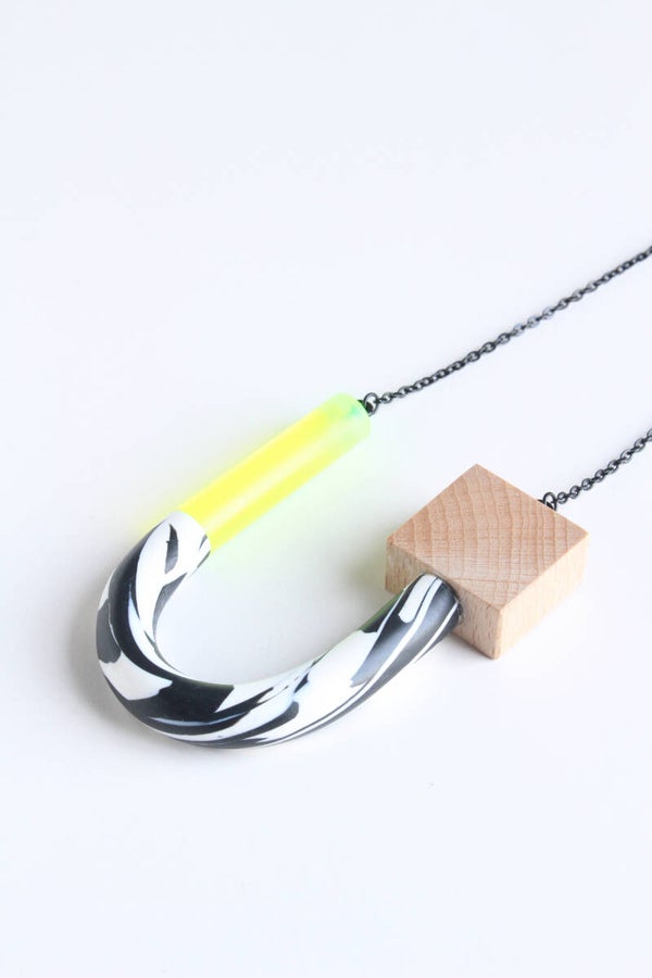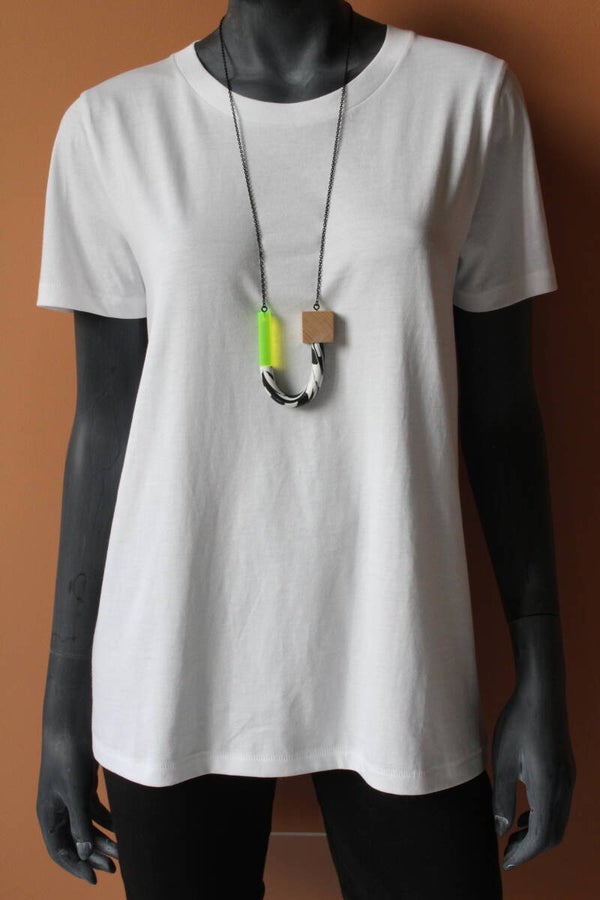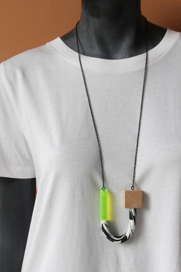 Ketting van polymeerklei, beukenhout en fluorgeel acrylaat aan een zwarte metalen ketting. De hanger is voorzien van een wax om het materiaal te beschermen tegen vocht en vuil.