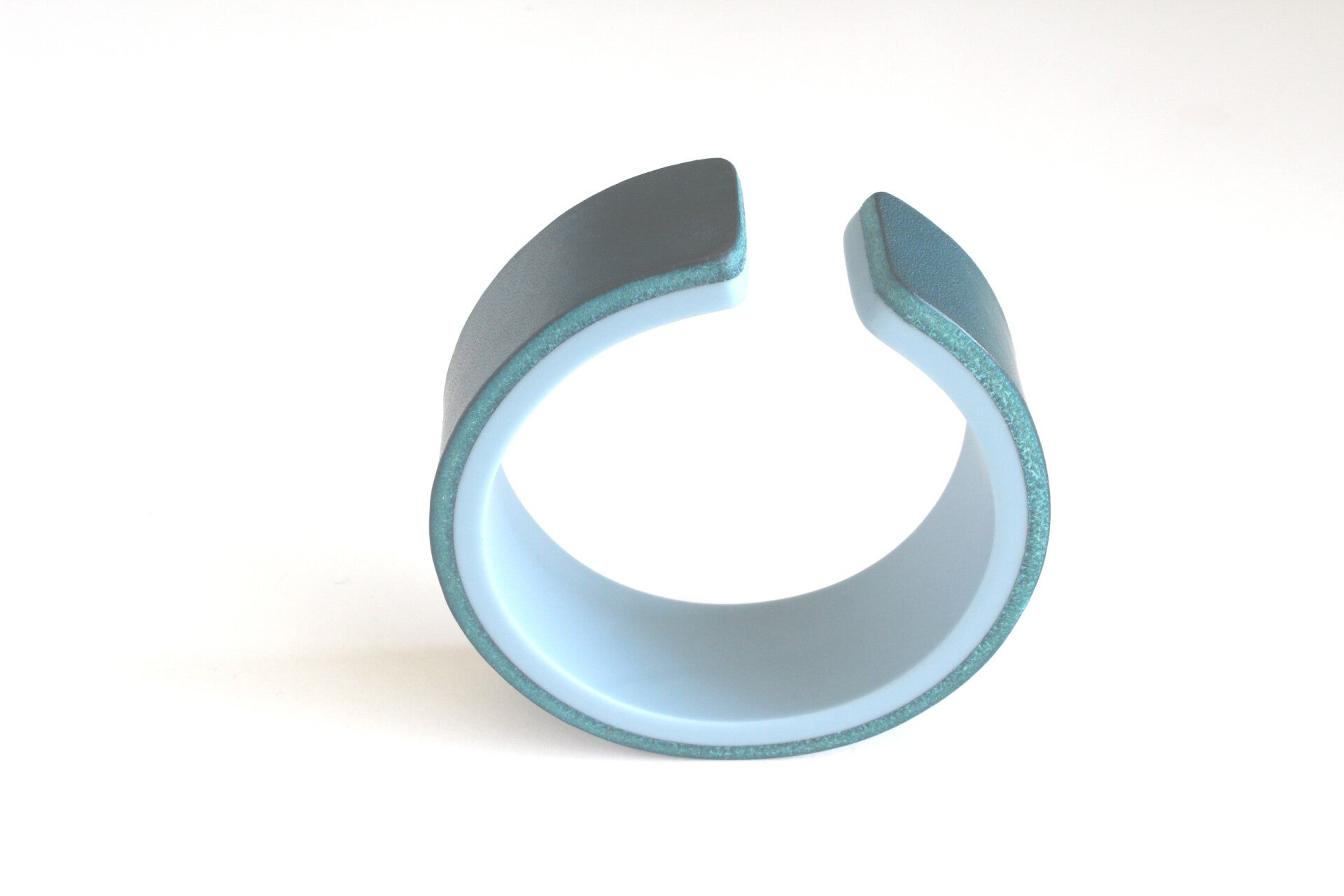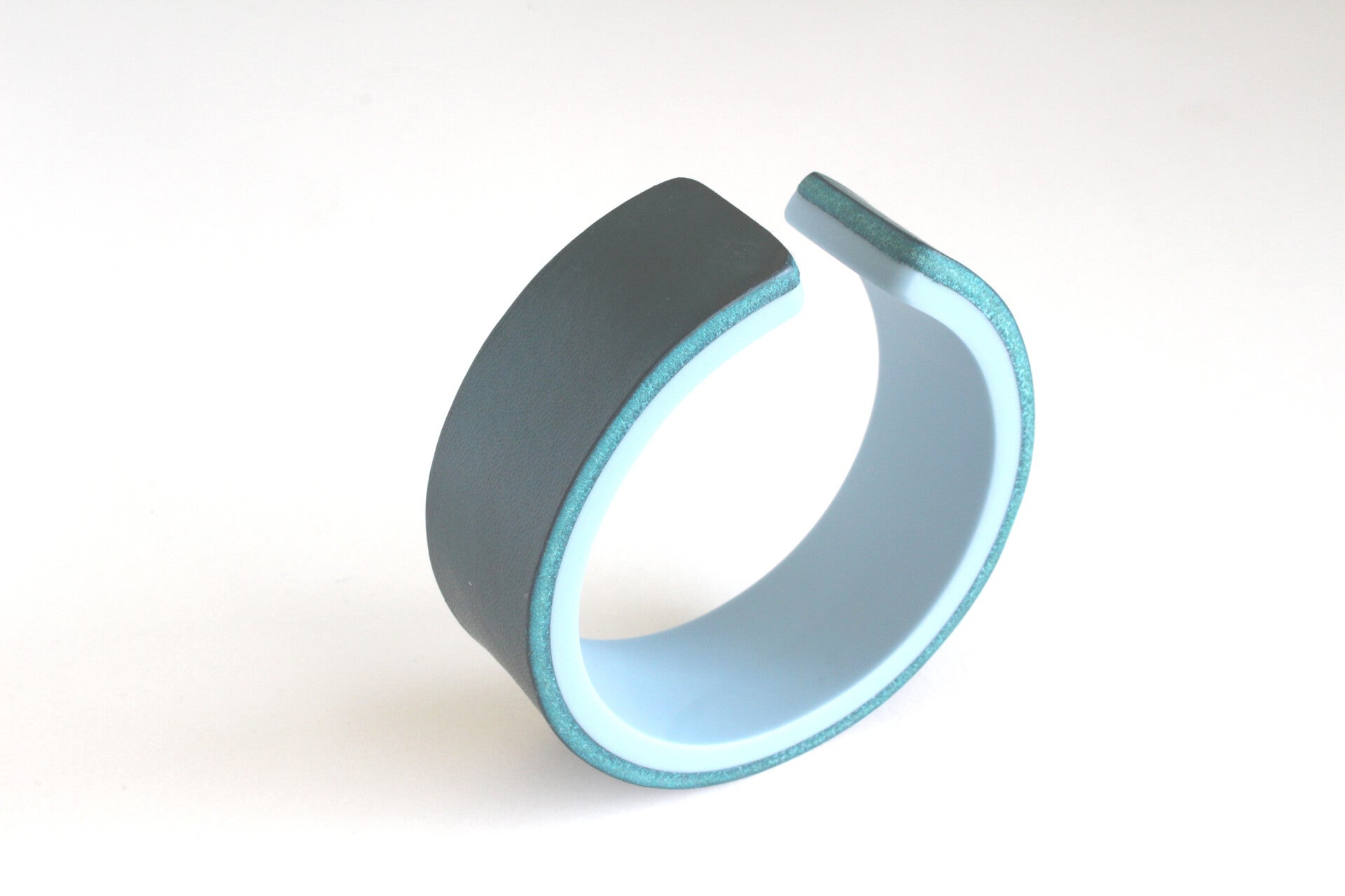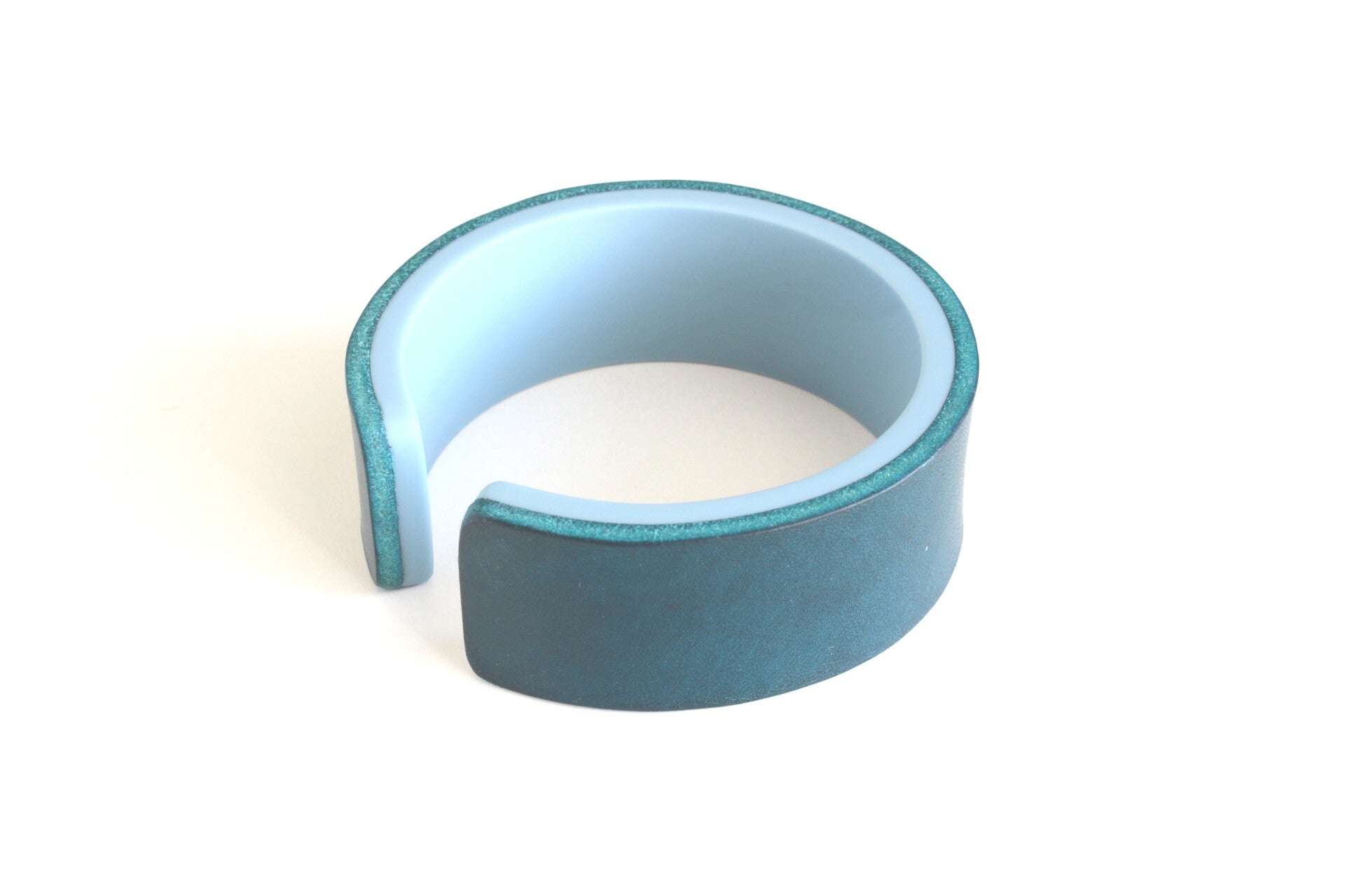 Armband van zacht blauw-grijs acrylaat/plexiglas en teal-blauw tuigleer. Het leer is voorzien van een wax om het materiaal te beschermen tegen vocht en vuil.