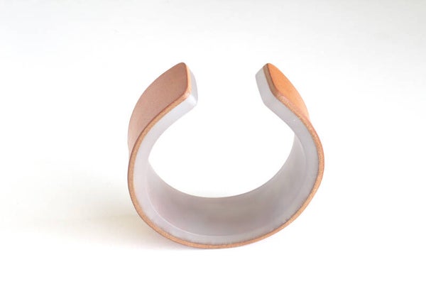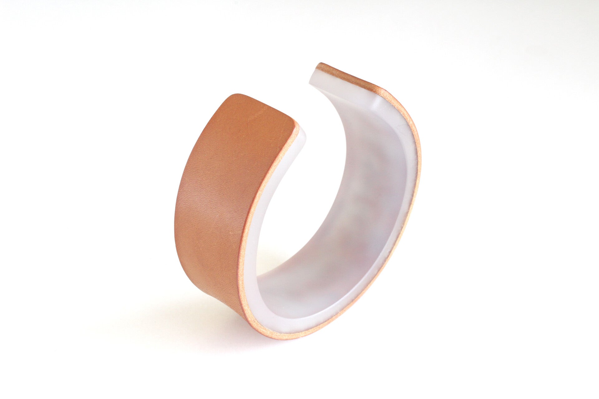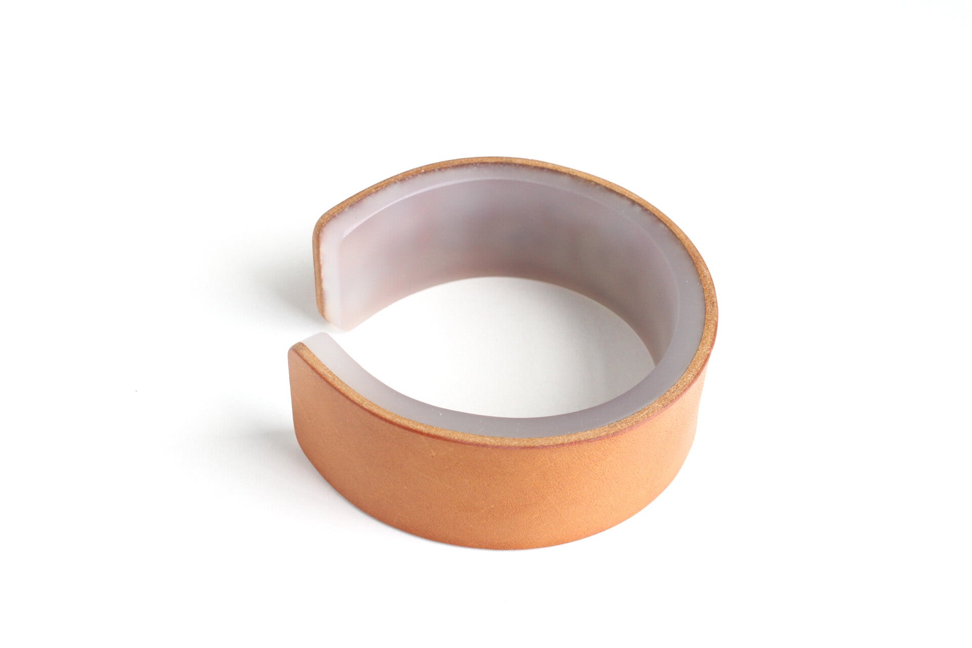 Armband van opaal acrylaat/plexiglas en naturel tuigleer. Het leer is voorzien van een wax om het materiaal te beschermen tegen vocht en vuil.