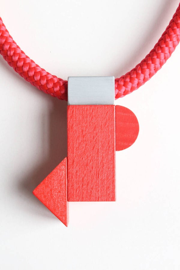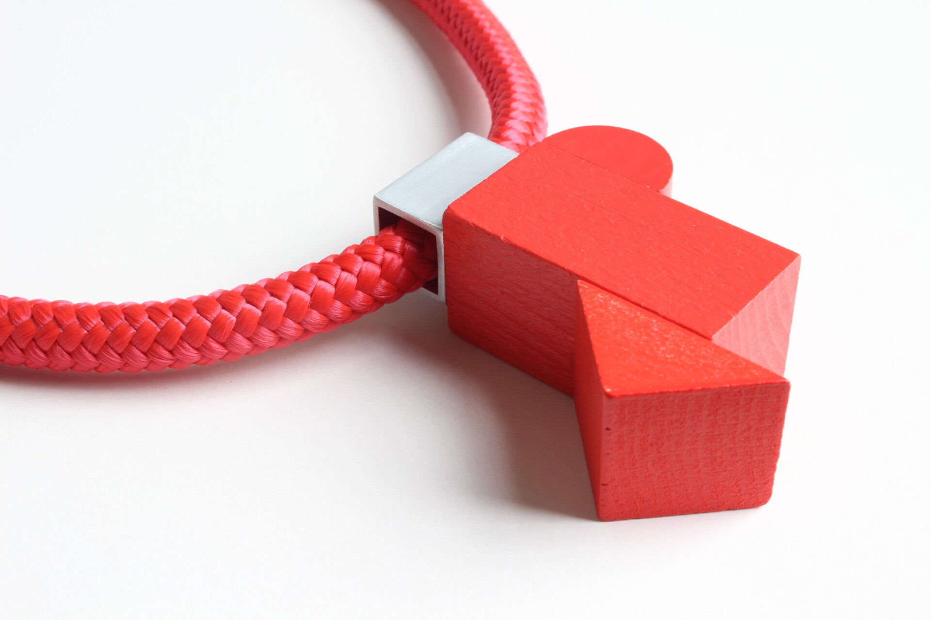 Ketting van geverfd beukenhout en aluminium aan een gevlochten koord. Bevestiging met een magneetsluiting.