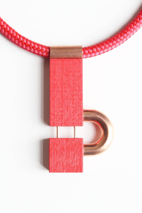 Ketting van geverfd beukenhout en koper aan een gevlochten koord. Bevestiging met een bajonet-magneetsluiting.