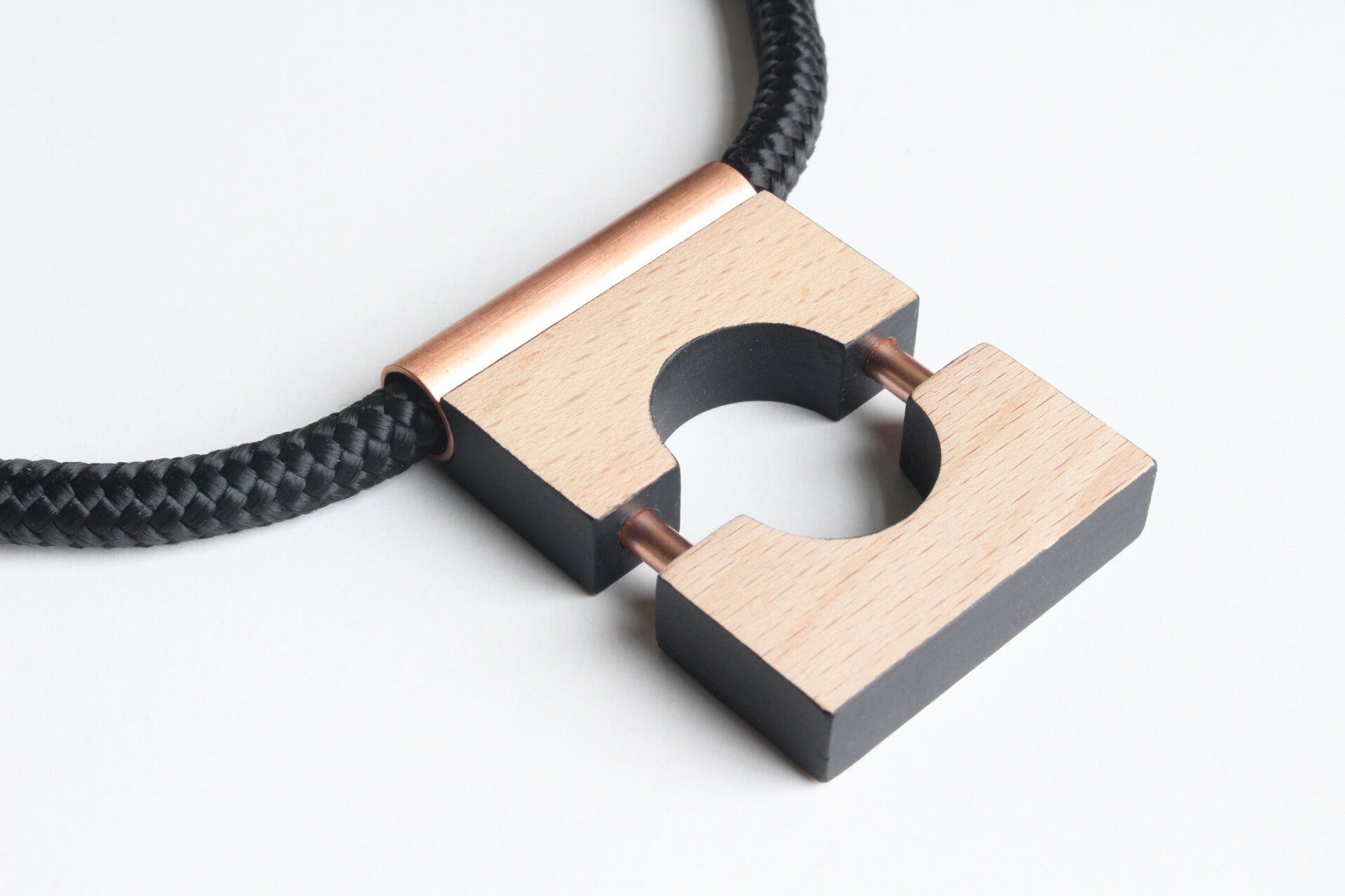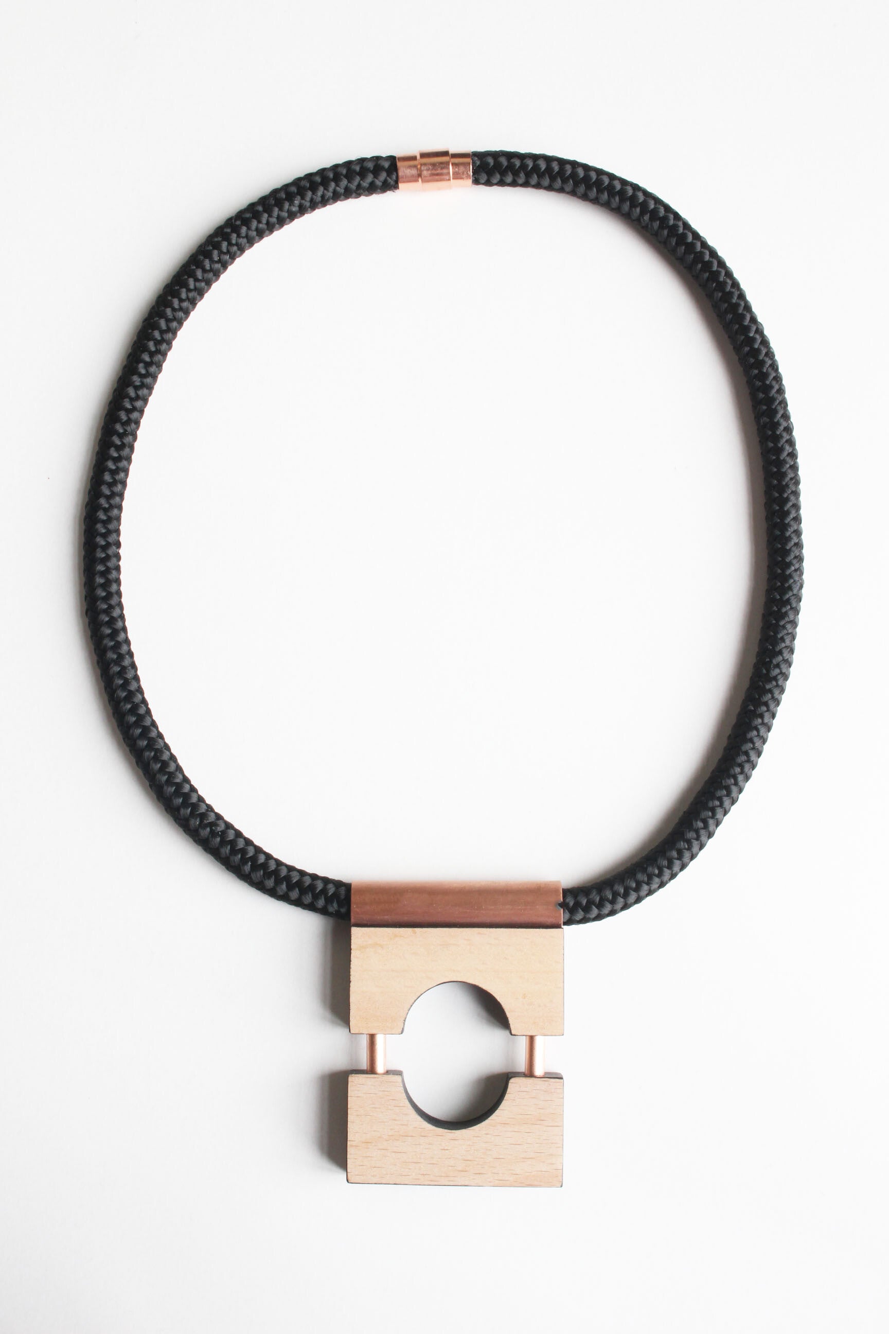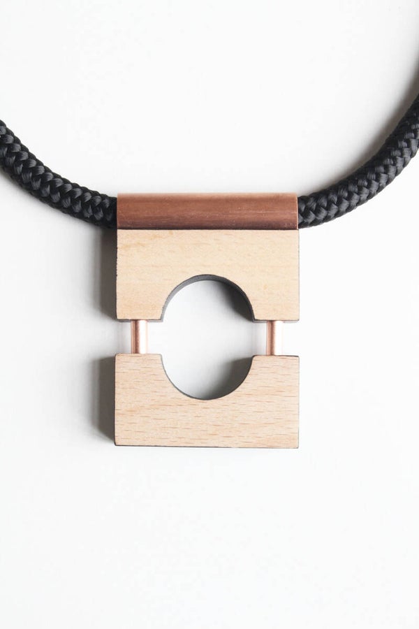 Ketting van deels geverfd beukenhout en koper aan een gevlochten koord. Bevestiging met een bajonet-magneetsluiting.