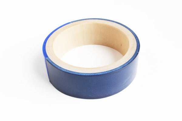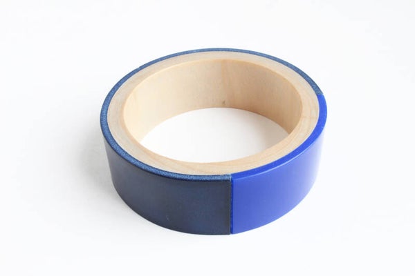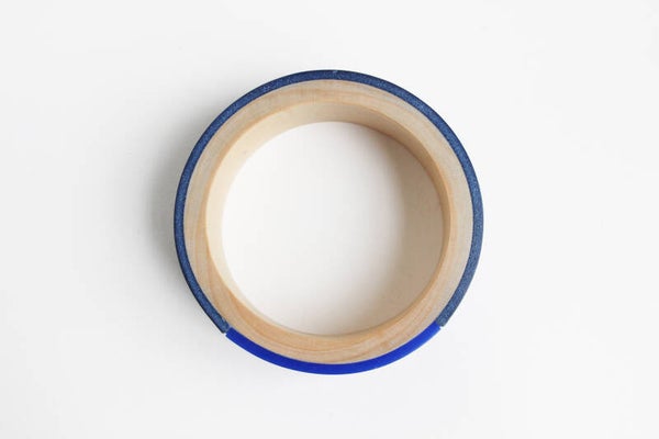 Armband van hout, gelamineerd met donkerblauw tuigleer en blauw acrylaat. Het leer is voorzien van een wax om het materiaal te beschermen tegen vocht en vuil.