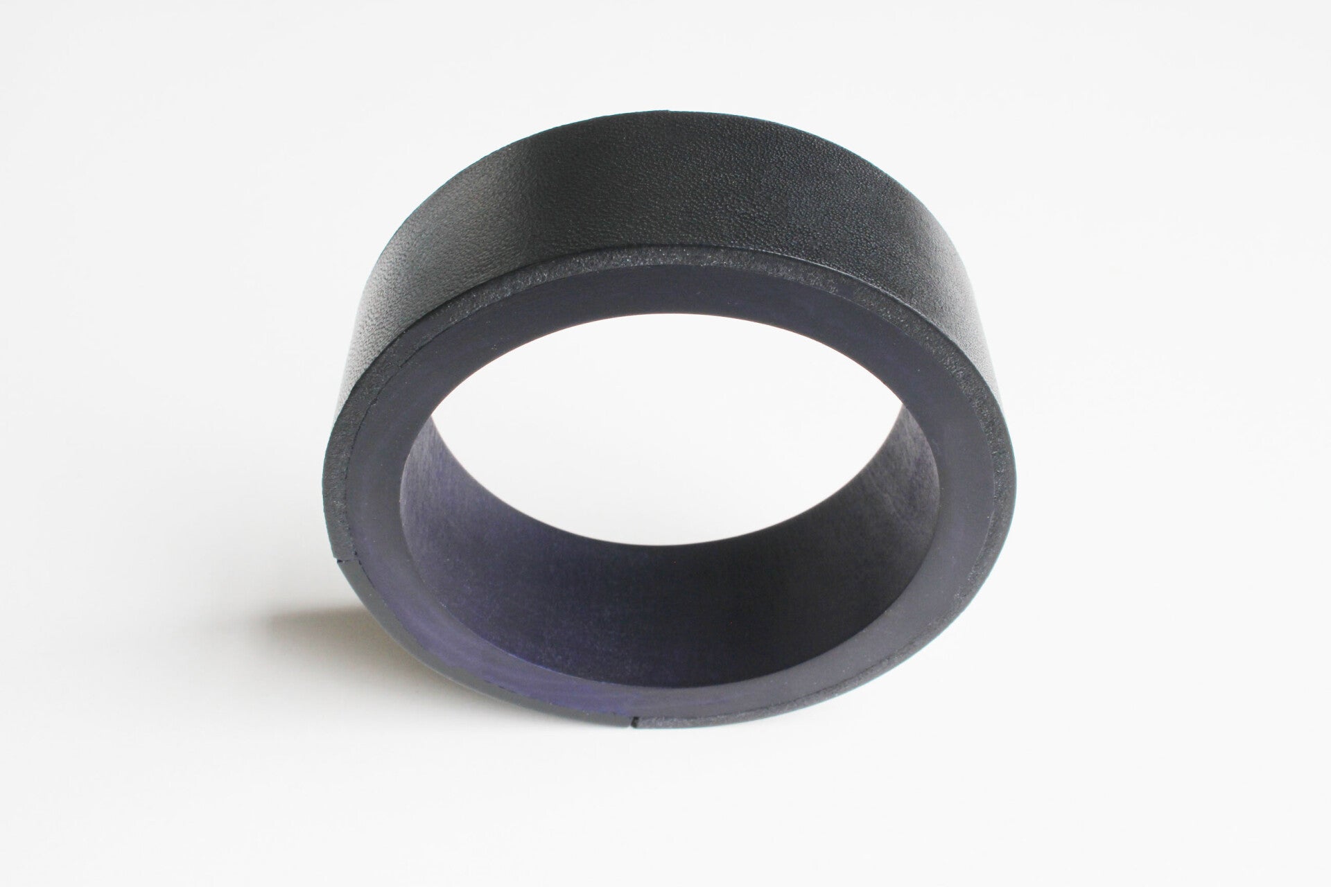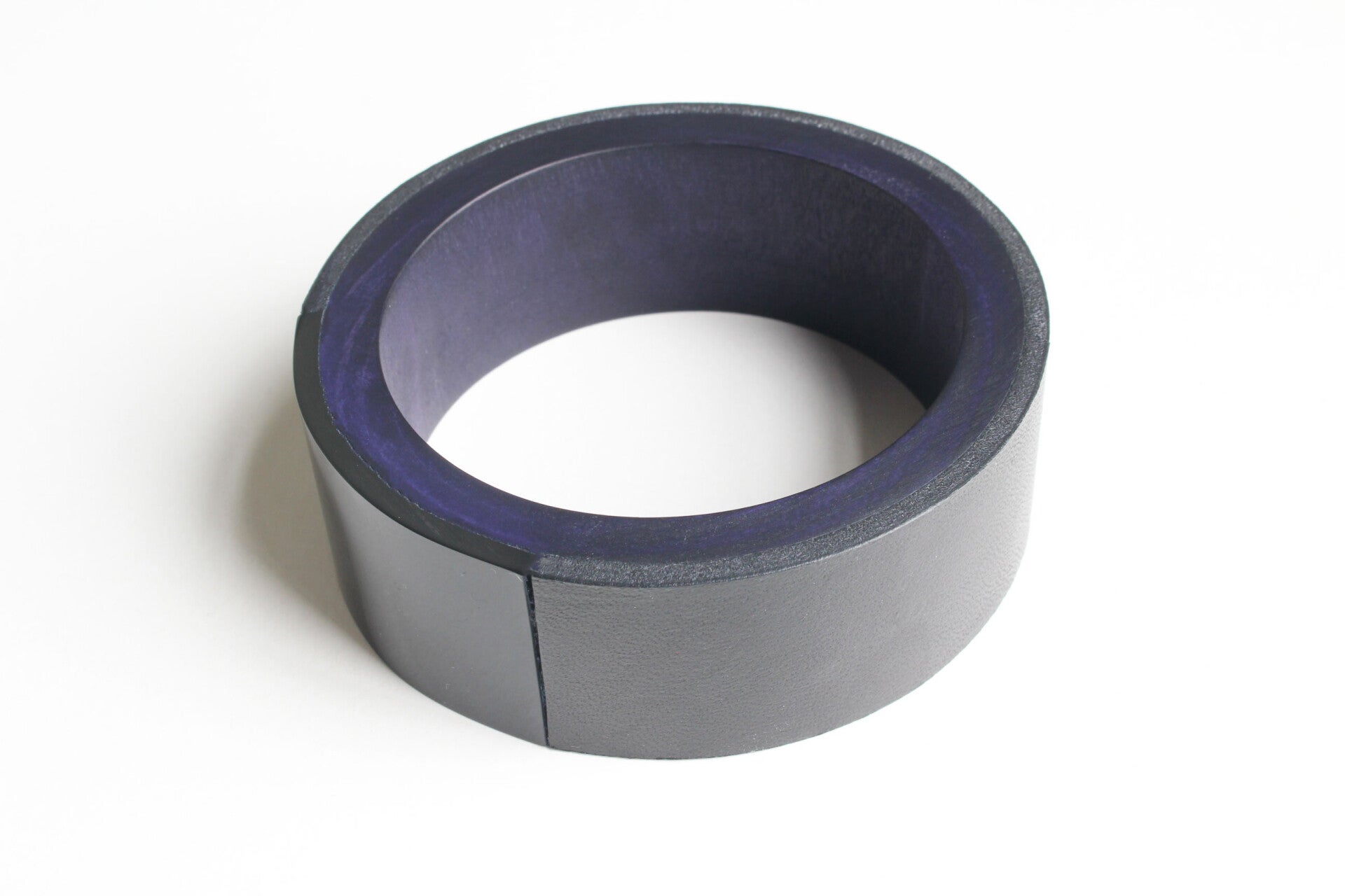 Armband van gekleurd hout, gelamineerd met zwart tuigleer en zwart acrylaat. Het leer is voorzien van een wax om het materiaal te beschermen tegen vocht en vuil.