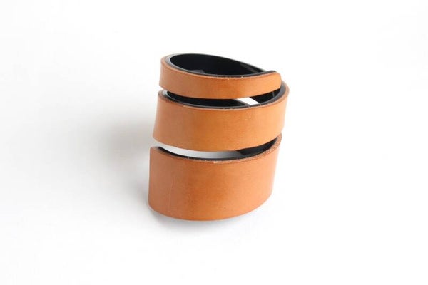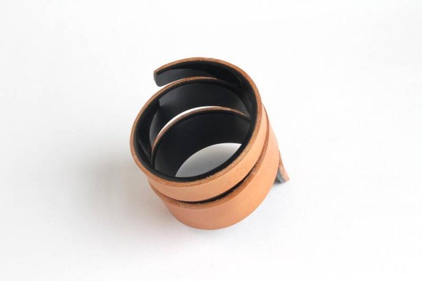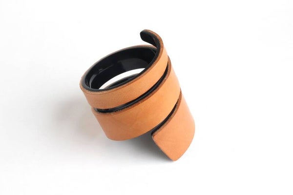 Armband van zwart transparant acrylaat / plexiglas en naturel tuigleer. Het leer is voorzien van een wax om het materiaal te beschermen tegen vocht en vuil.Binnenmaat ± 6,6 cm doorsnee