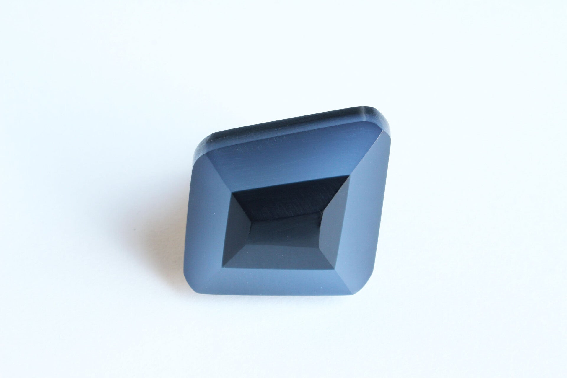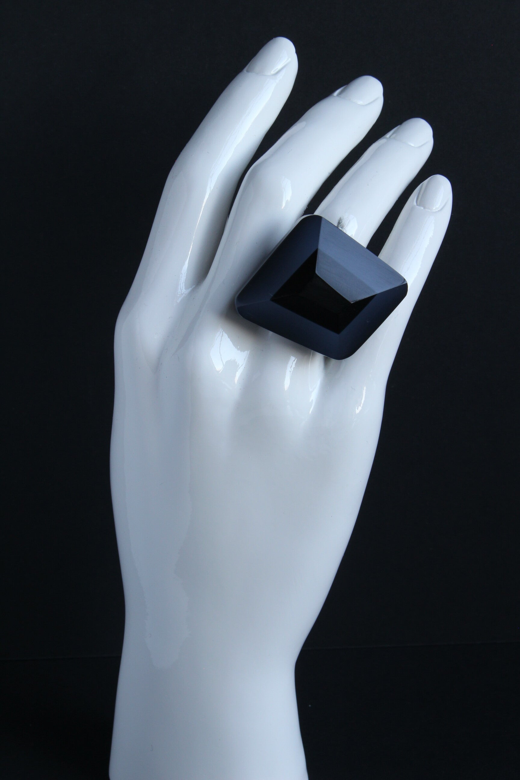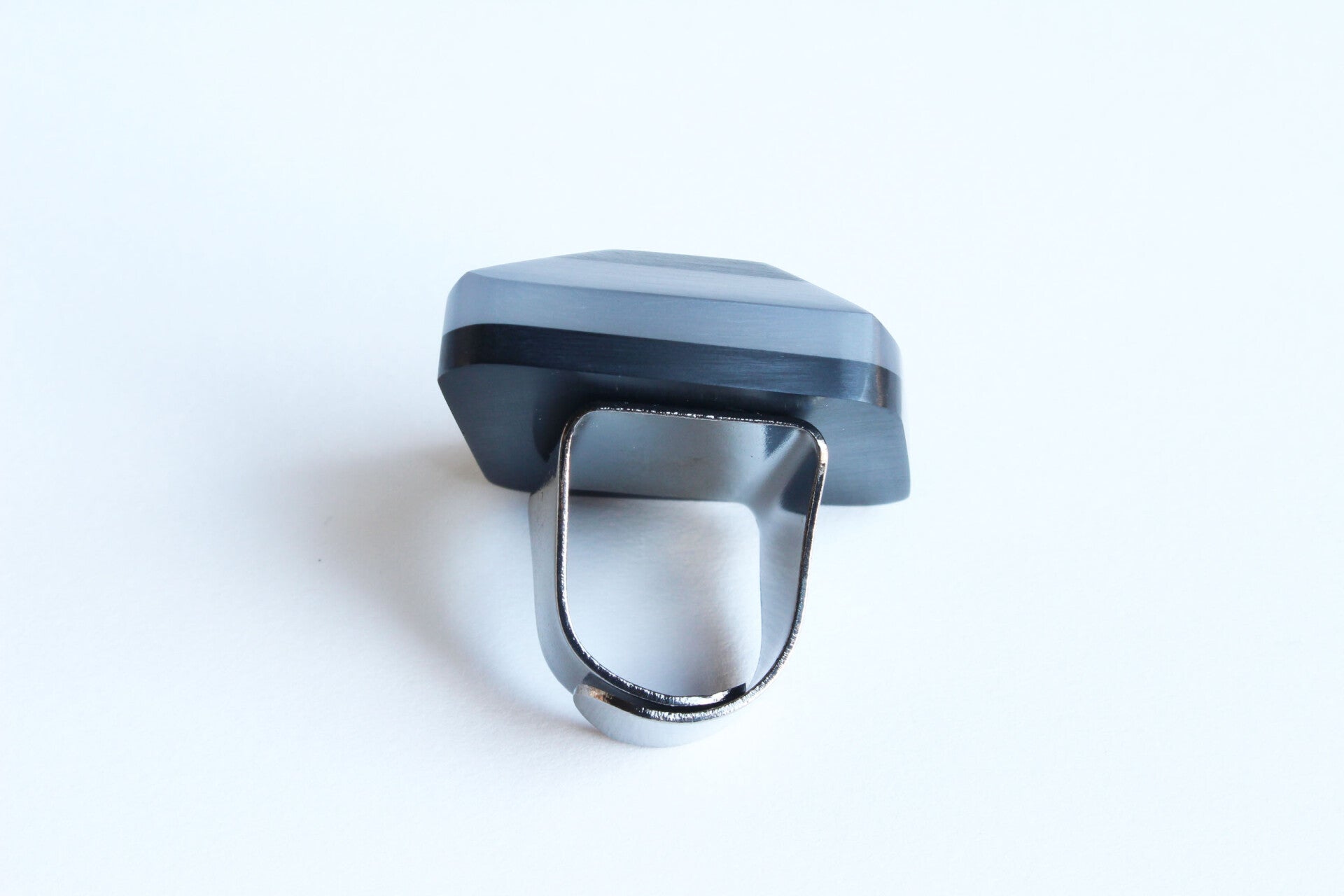 Verstelbare gunmetal ring van zwart en opaal gelamineerd acrylaat. Afmetingen ± 3,2 cm x ± 3,1 cm, ring 1,7 x 1,9 cm
