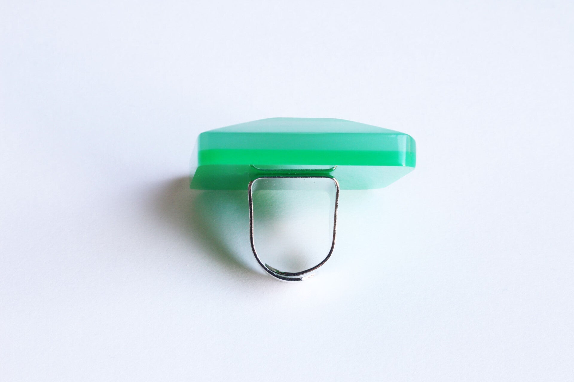 Verstelbare metalen ring van groen en opaal gelamineerd acrylaat. Afmetingen ± 4,3 cm x ± 4,4 cm, ring 1,7 x 1,9 cm
