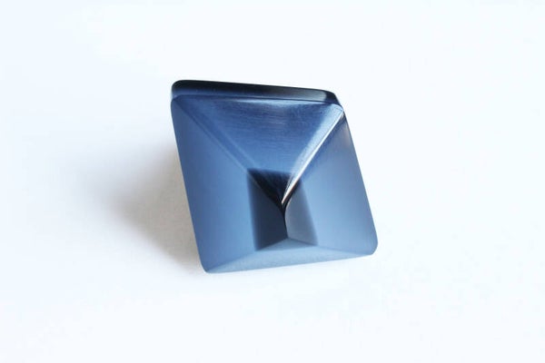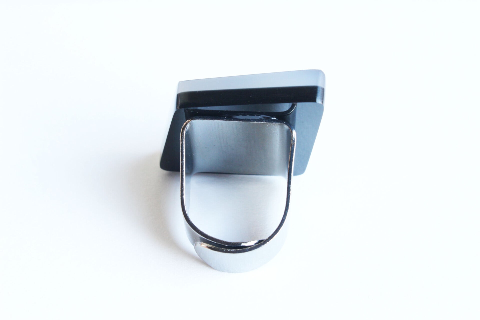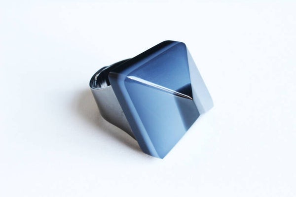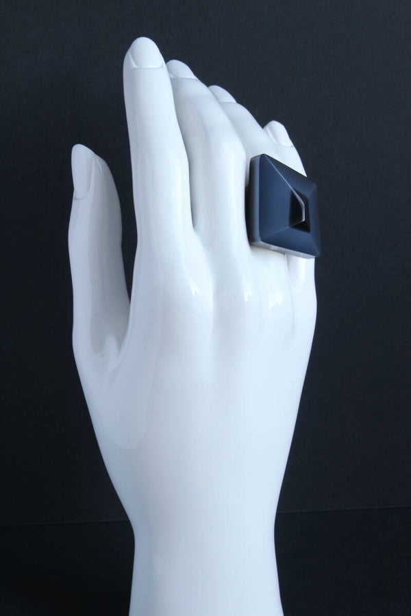 Verstelbare gunmetal ring van zwart en opaal gelamineerd acrylaat. Afmetingen ± 2,8 cm x ± 2,6 cm, ring 1,7 x 1,9 cm