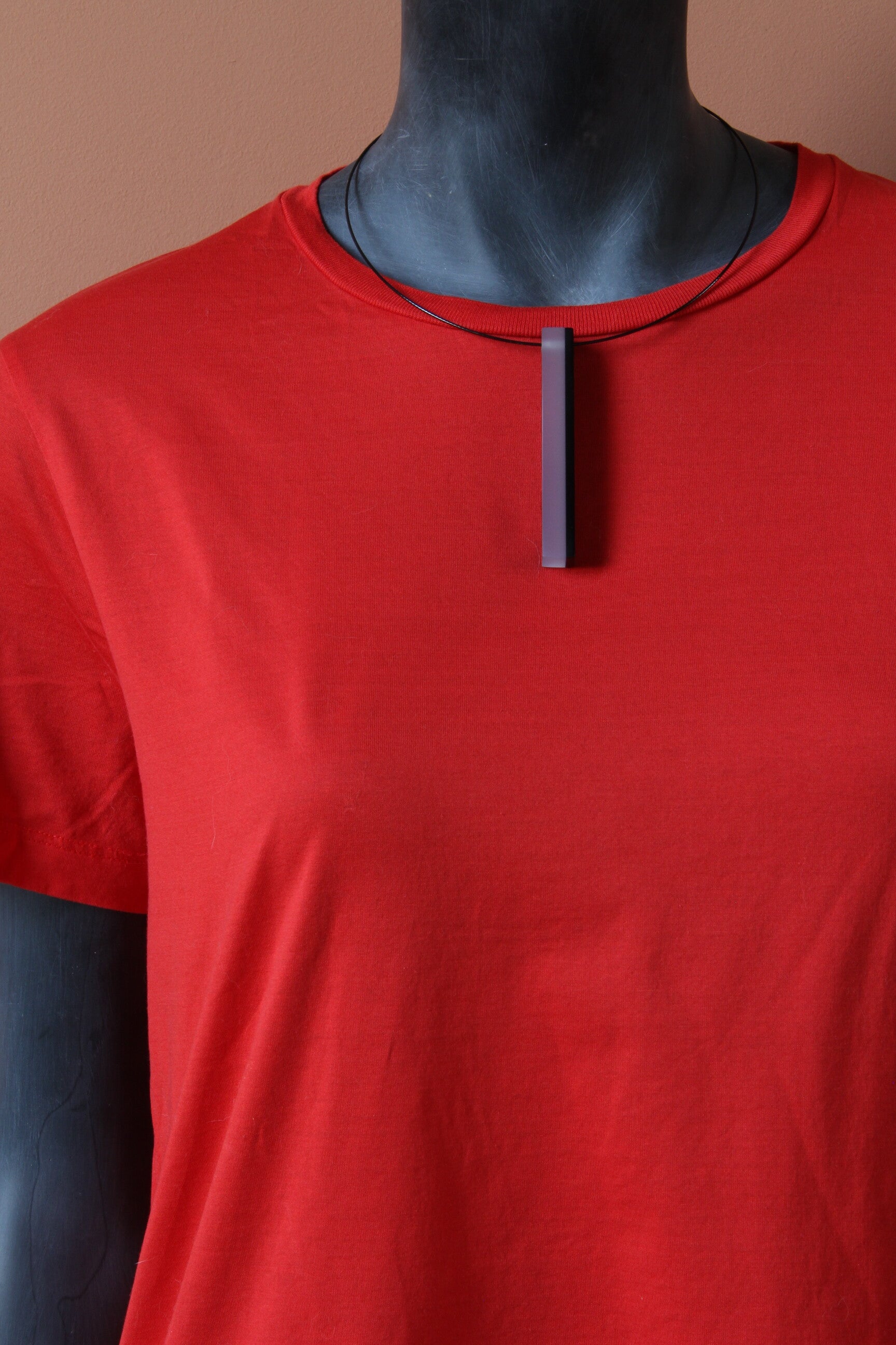Hanger van gelamineerd zwart en opaal acrylaat aan een spang van staaldraad met een draaisluiting. Hanger: hoogte ±8 cm x breedte ±1 cm, spang: lengte ±45 cm.