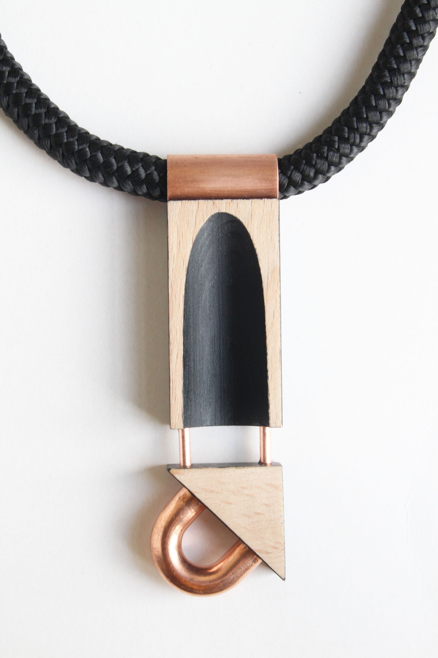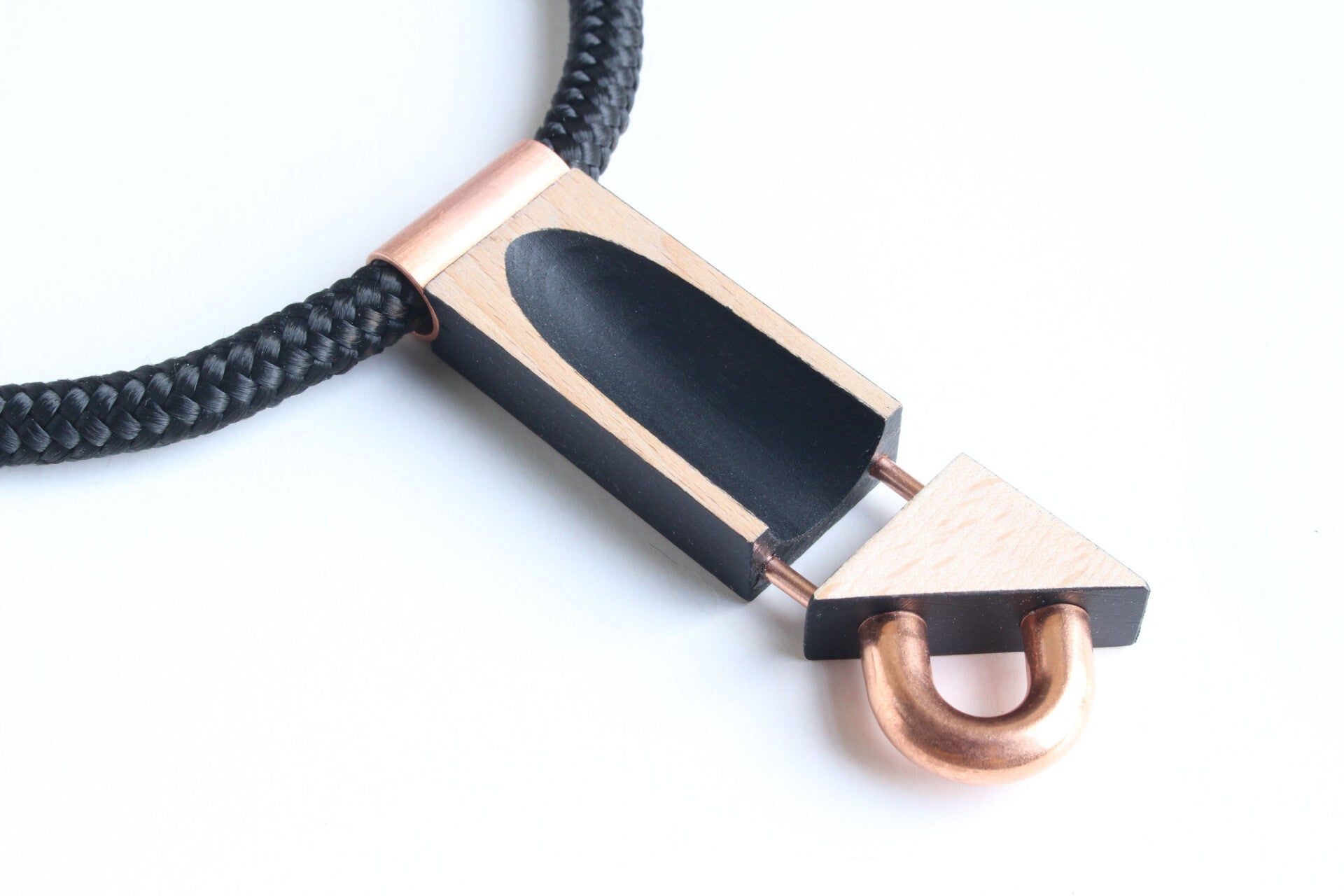 Ketting van deels geverfd beukenhout en koper aan een gevlochten koord. Bevestiging met een bajonet-magneetsluiting.