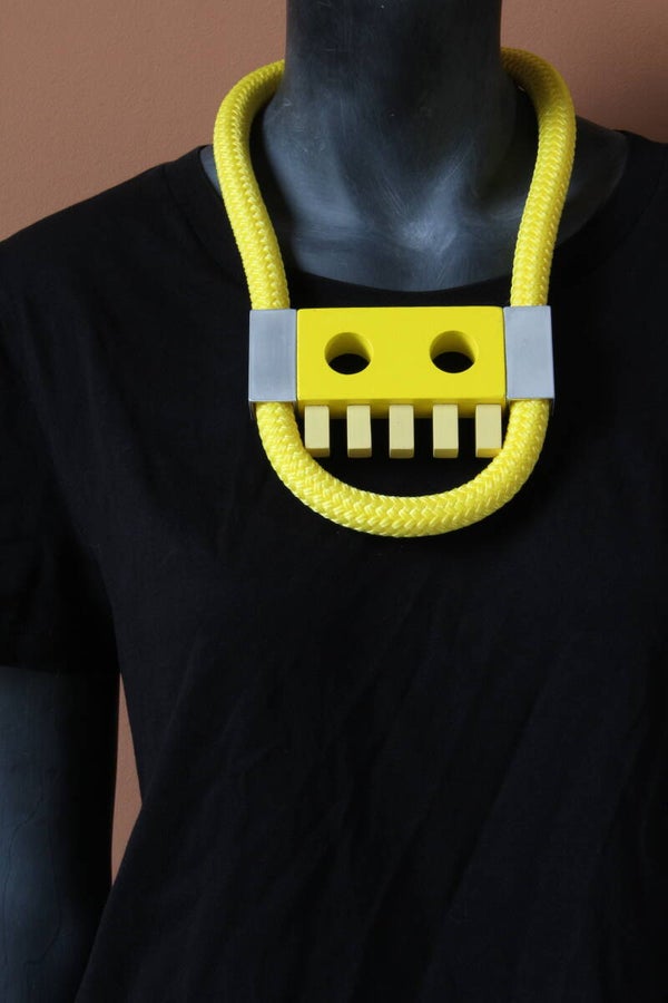 Ketting van geverfd beukenhout en aluminium aan een dubbelgevlochten koord. Bevestiging met een magneetsluiting.