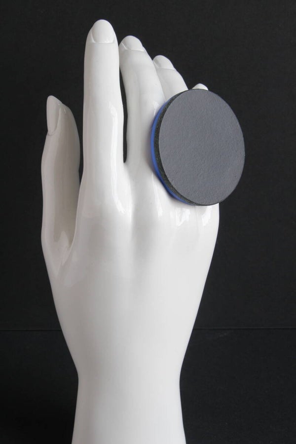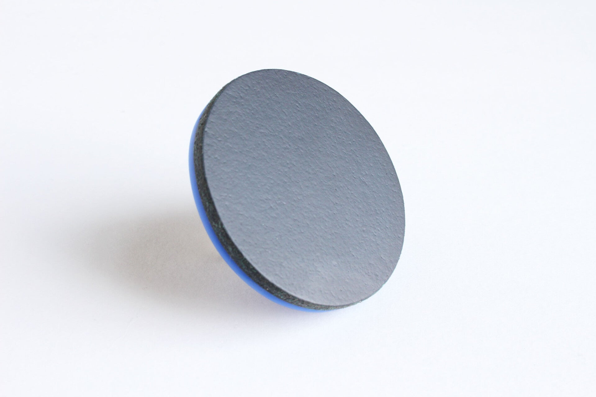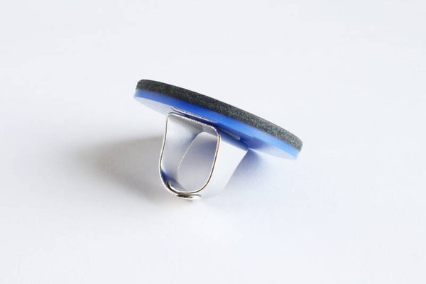 Verstelbare metalen ring van blauw acrylaat gelamineerd met donkerblauw tuigleer.