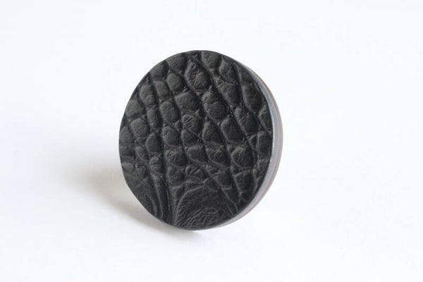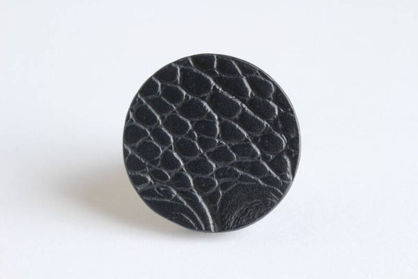 Verstelbare gunmetal ring van zwart acrylaat gelamineerd met zwart tuigleer met croco print.De print kan per exemplaar wat verschillen