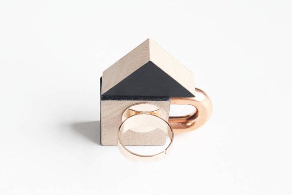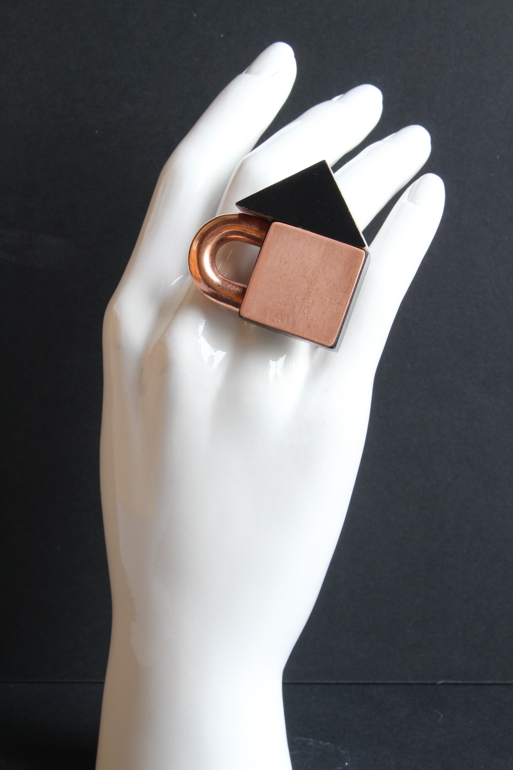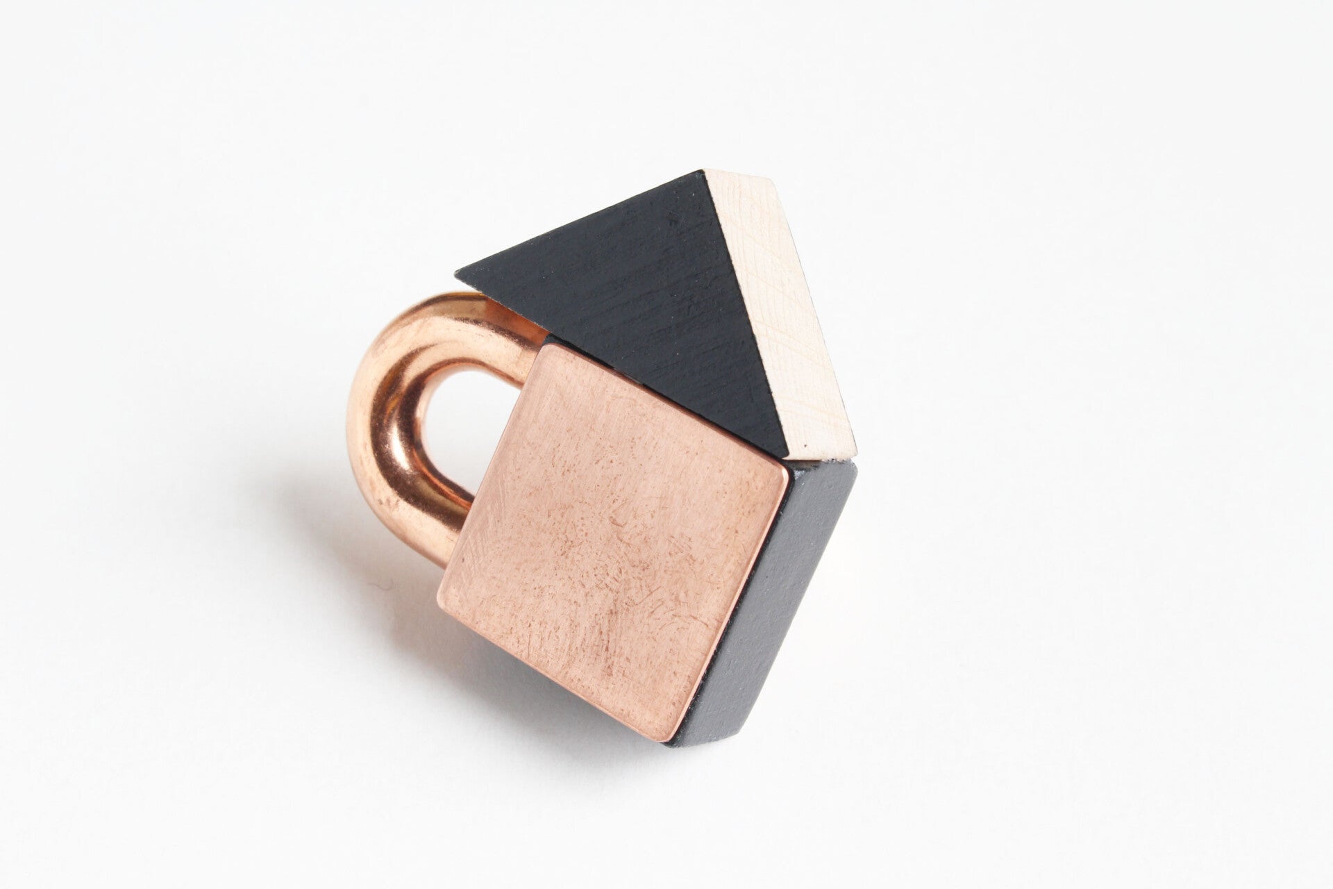 Verstelbare metalen ring van deels geverfd beukenhout en koper.