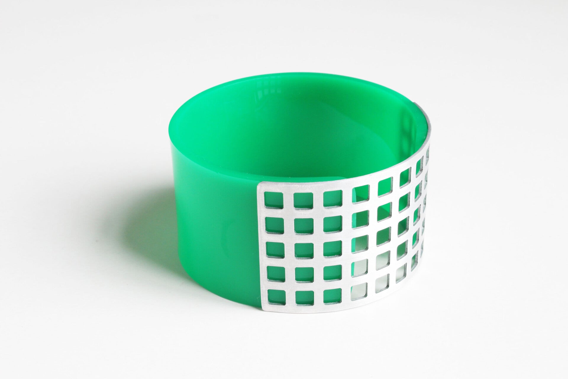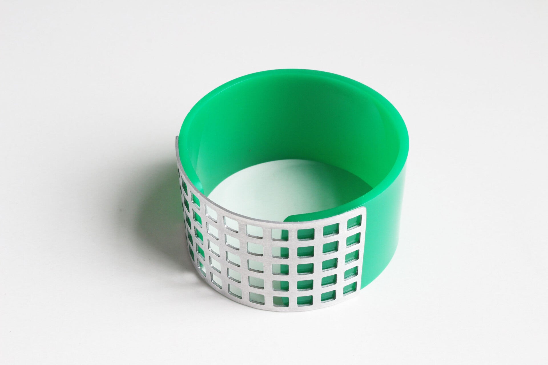 Armband van groen acrylaat en aluminium. Breedte 4 cm, binnenmaat 6,7 cm