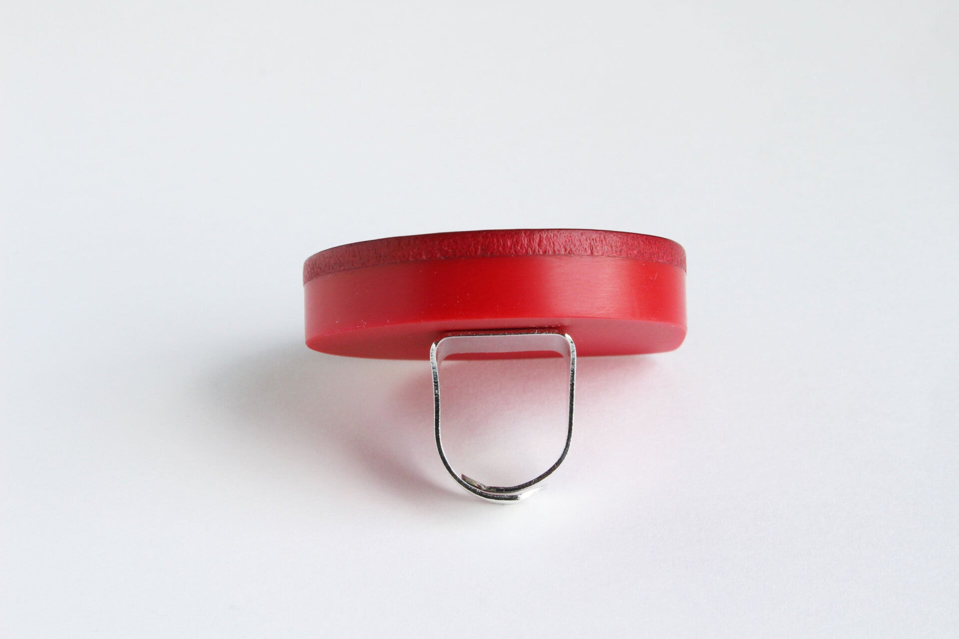 Verstelbare metalen ring van rood acrylaat gelamineerd met donkerrood tuigleer.