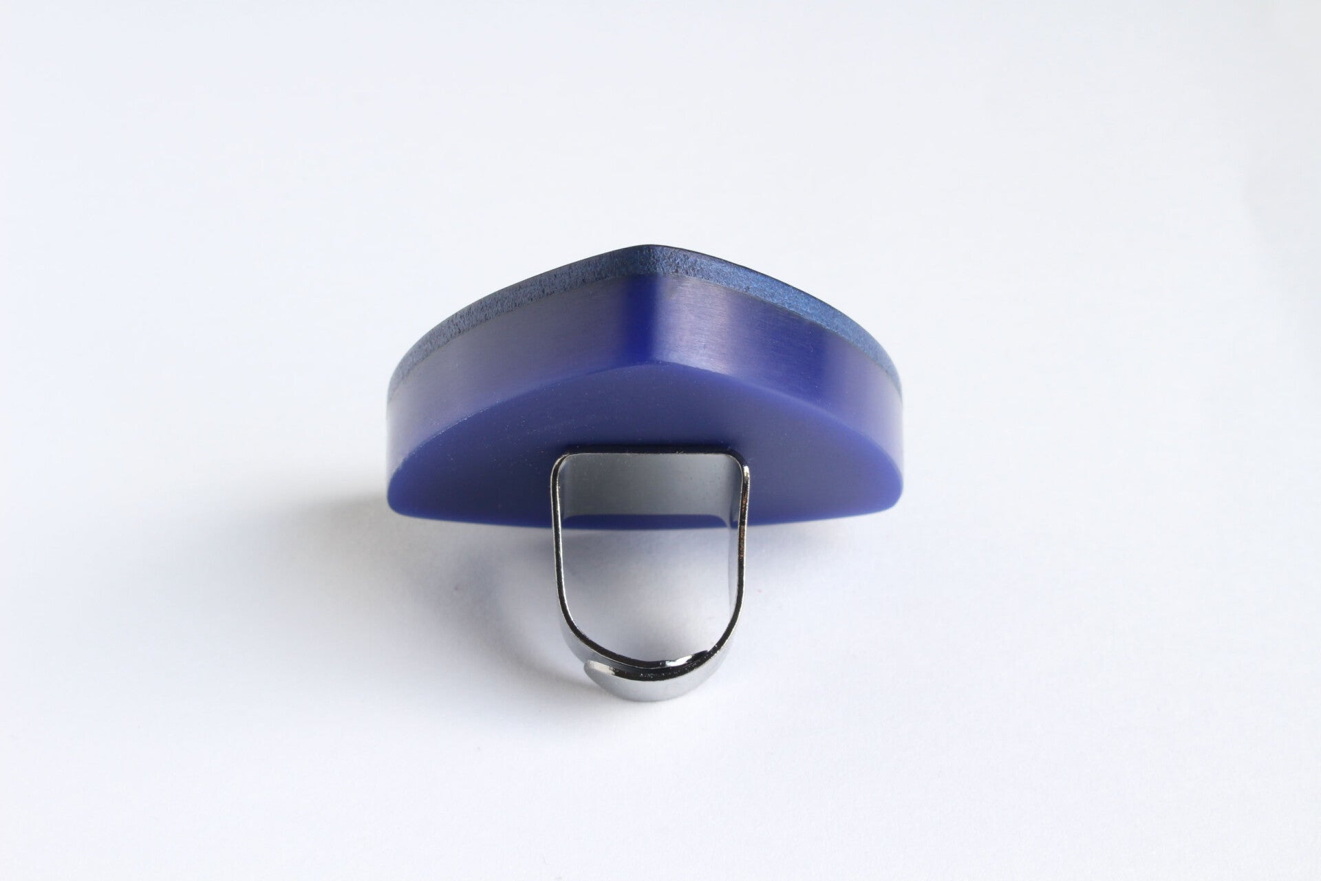 Verstelbare gunmetalen ring van blauw acrylaat gelamineerd met blauw tuigleer.