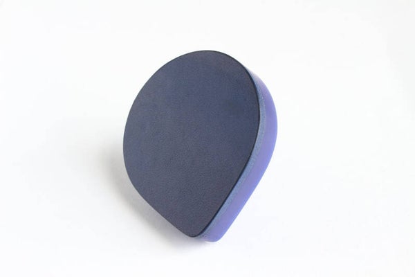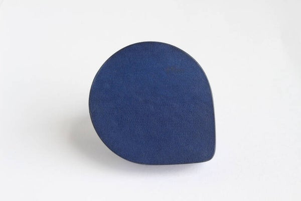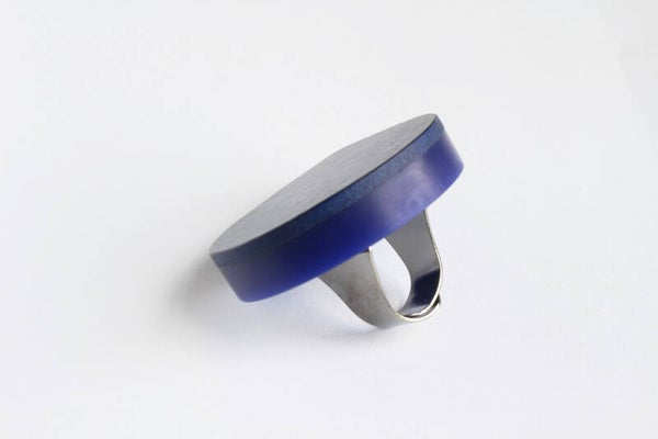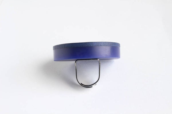 Verstelbare gunmetalen ring van blauw acrylaat gelamineerd met blauw tuigleer.