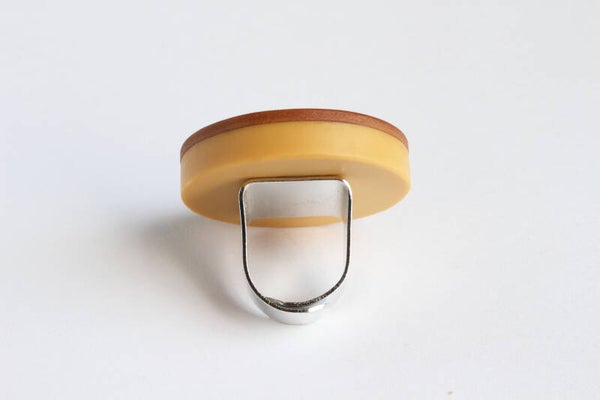 Verstelbare metalen ring van cognac acrylaat gelamineerd met cognac tuigleer.