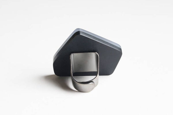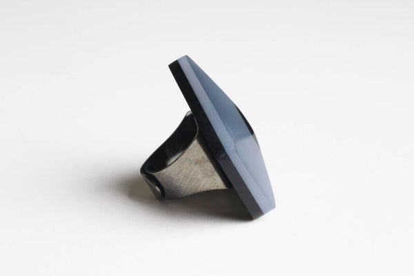 Verstelbare gunmetal ring van zwart en opaal gelamineerd acrylaat. Afmetingen ± 5 cm x ± 4,8 cm, ring 1,7 x 1,9 cm