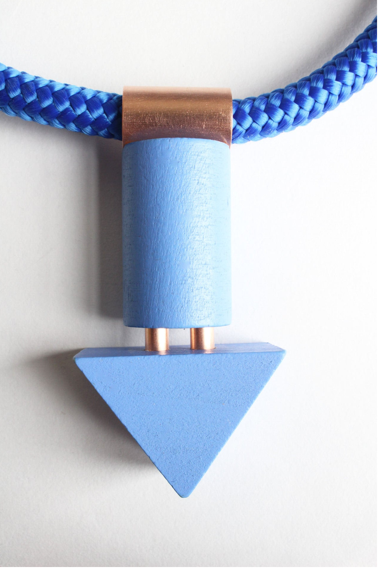 Ketting van geverfd beukenhout en koper aan een gevlochten koord. Bevestiging met een bajonet-magneetsluiting.