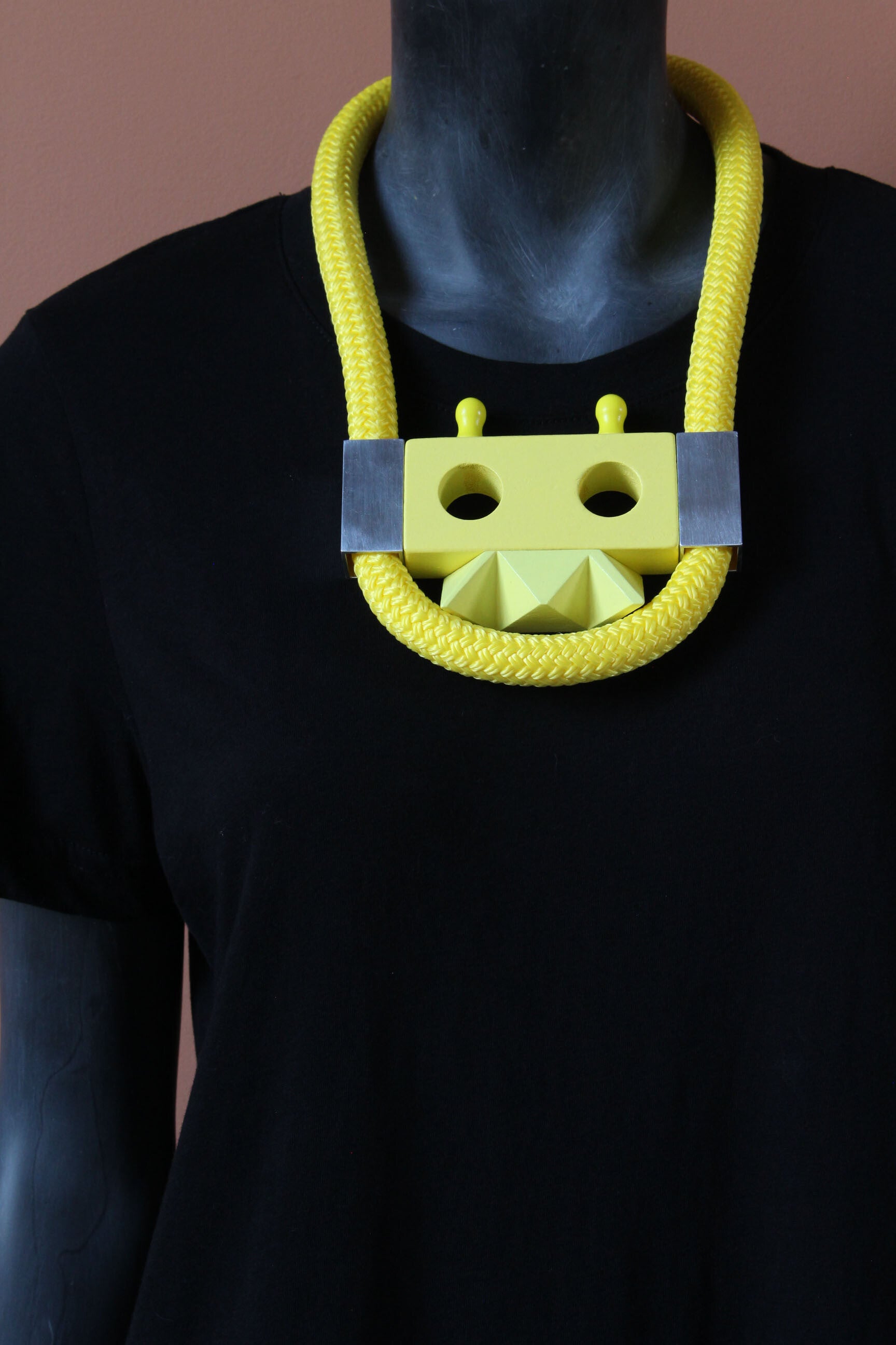 Ketting van geverfd beukenhout en aluminium aan een dubbelgevlochten koord. Bevestiging met een sterke magneetsluiting.