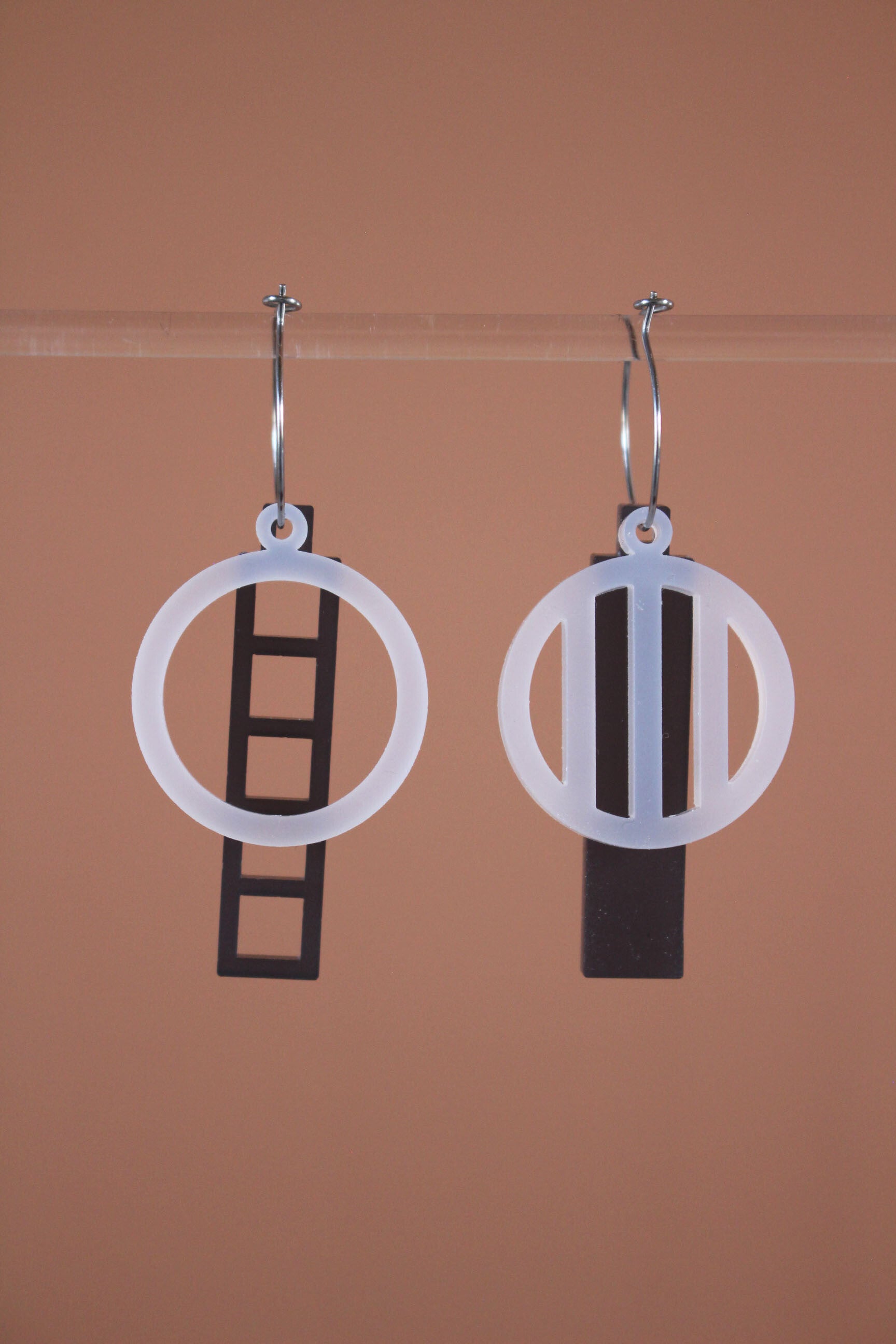 Oorbellen van opaal wit en grijs acrylaat aan oorringen van hypoallergeen rvs.